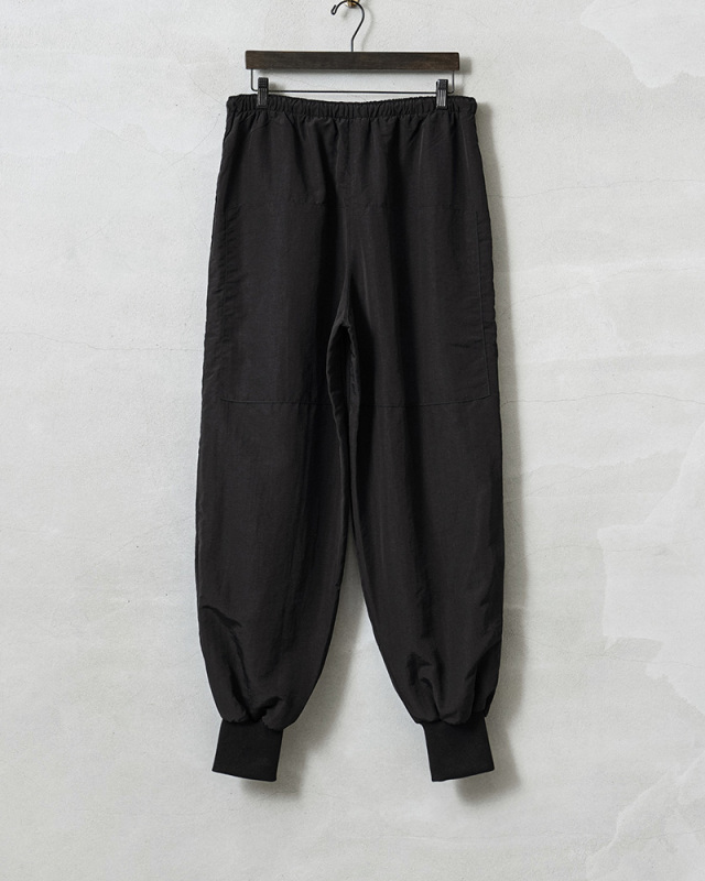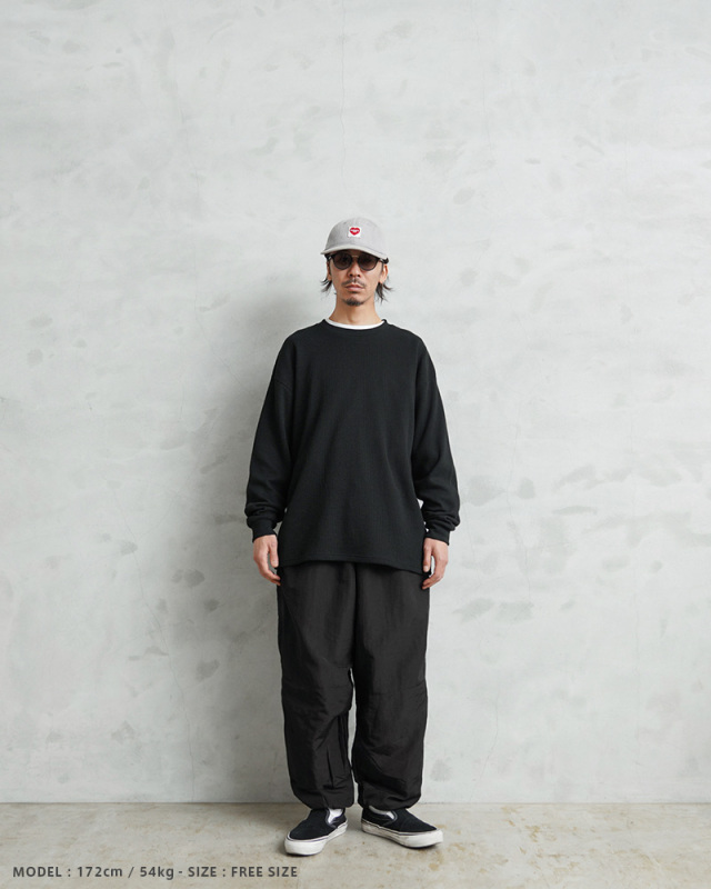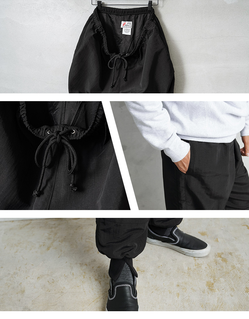 | 備考 | ウエストの表記は平置き最小値~ゴムを伸ばした時の最大値となります。ウエストにはドローコードが内蔵されているため、上記の最小値から30cm程絞ることが可能です。総丈、股下は9cmの裾リブを含んだ長さです。実物商品のためサイズに個体差がございます。 | |||||
