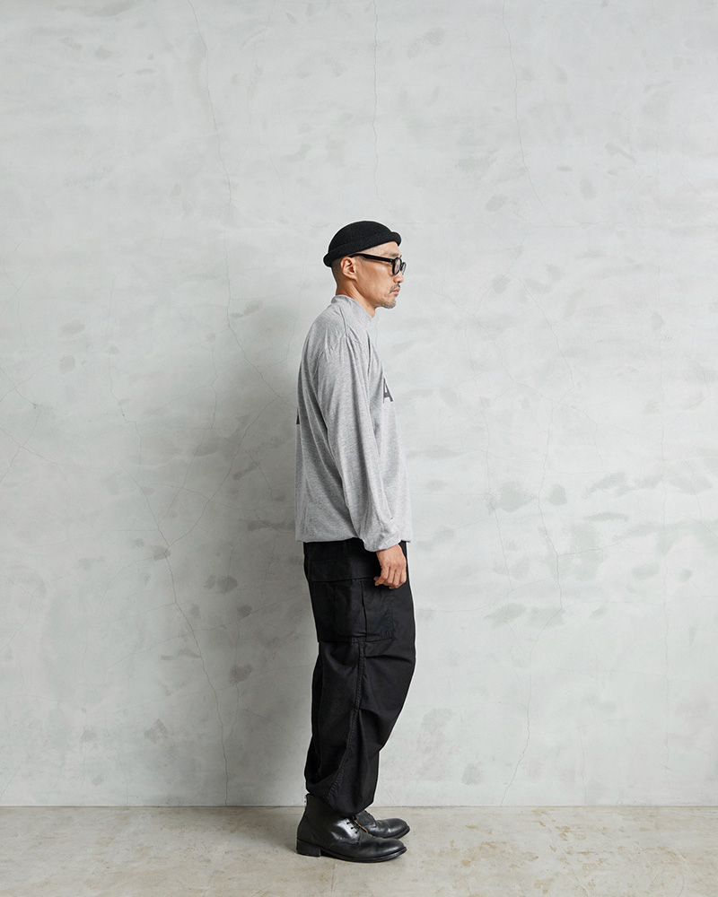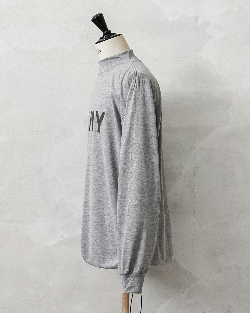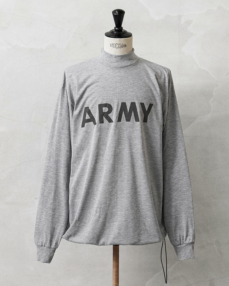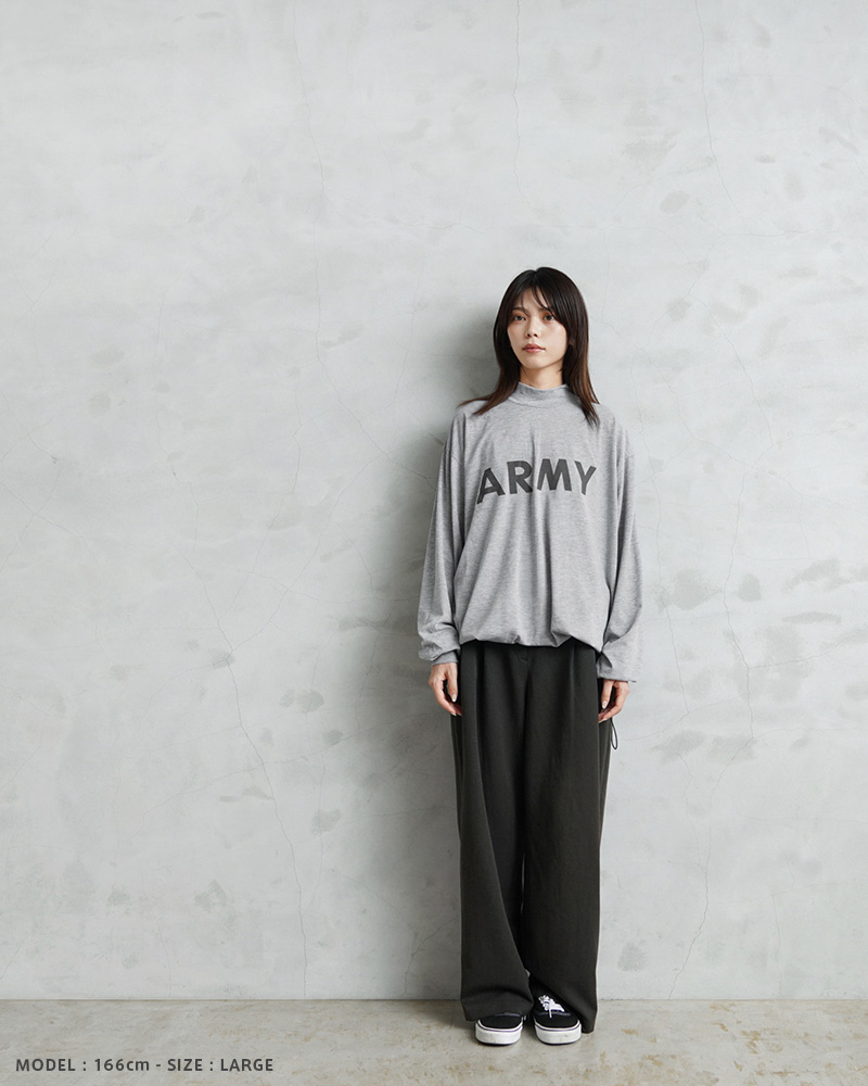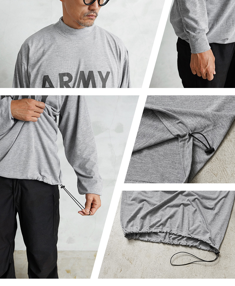 米軍で採用されていたトレーニングTシャツを着用しやすい着丈にカットし、裾部分にドローコードを追加したリメイクを施しました!裾が袋状になるまで絞れますので、お好みのシルエットや丈感にアレンジするなど、多彩な着こなしがお楽しみいただけます。速乾性に優れ、サラッとした着心地のポリエステル生地を使用しています。体から放出される熱や汗を生地が調整することで寒暖に関係なく快適な着心地を実現しています、とても柔らかく肌触りも良い素材です。モックネックタイプのネックラインで、1枚で着てもすっきりとした印象を与え上品さも感じさせます。インナーとしても、首周りがバランス良く仕上がっていますので幅広く着回せておしゃれに着こなせます!