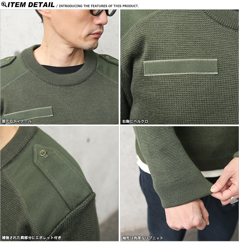 | 商品説明 | リジェクト 訳あり品 実物 USED フランス軍 コマンドセーター SAINT JAMES(セントジェームス)のご紹介です。 バスクシャツなどで有名なSAINT JAMESがフランス軍に納入していた希少なコマンドセーターが入荷! 肩や肘部分のあて布で補強されたデザインや肩部分のエポレット、胸部分のベルクロなどミリタリーでは定番のデザインながら米軍物に比べ何処か品がある雰囲気が特徴的です。 Laine peigneは梳毛(そもう)ウールという毛足の長い羊毛糸に撚りをかけて1本の糸にし、糸に撚りをかけるときに、短い毛足の毛を取り除き、長毛だけを使って、強く撚り、糸の表面が滑らかで強く、光沢のある糸で高級ニット製品にも使用されているウールです。 Chiorofbreはポリ塩化ビニル系の繊維で保温性があり吸水性がないので、雨や汗で濡れても体を冷やさないという利点があります。 こちらは焦げ跡やリペアなど不具合のある商品を選別しております。多少のリペアを施していただいてからの着用、もしくはリメイク資材としてもおすすめです。ファーストクオリティの品質を強くお求めの方は念の為ご購入をお控えくださいますようお願い致します。 |