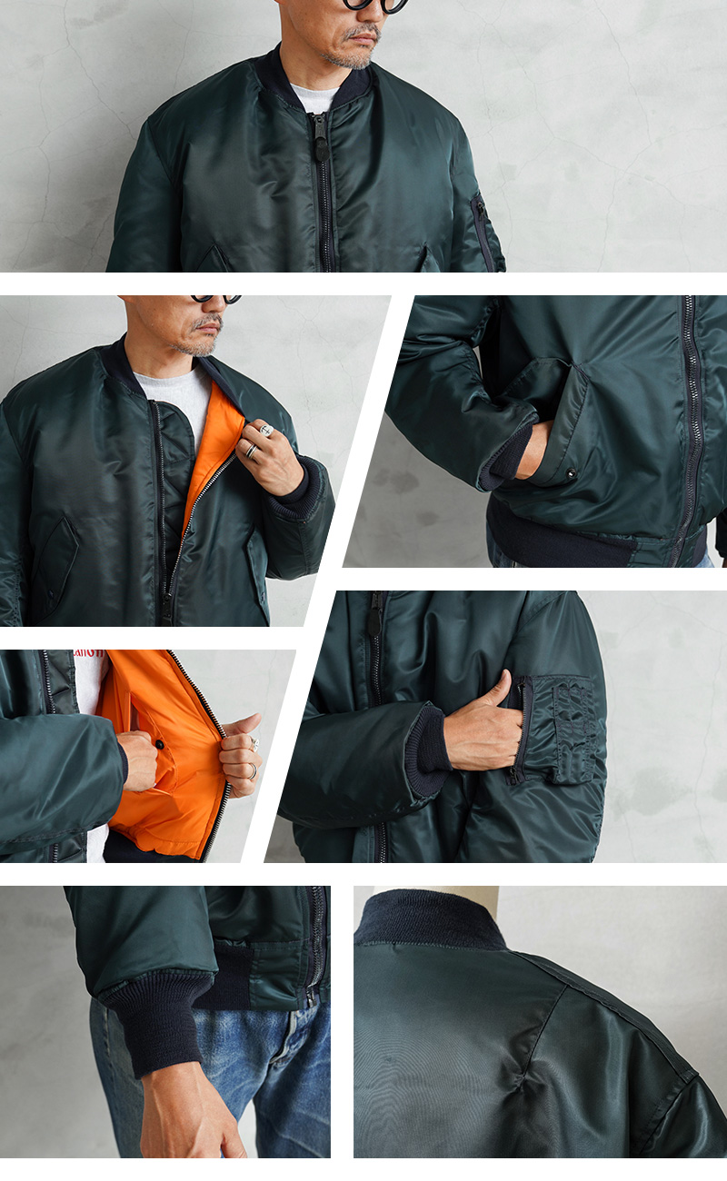ライニングにはレスキューオレンジが採用されており、墜落時に裏返して着ることで救助隊に発見されやすくするフライトジャケットならではのディテールも忠実に再現したモデルです。オレンジライニングにフラップポケットのデザインは1970年代に採用されていたディテールで、リバーシブルで使えるのもポイントです。