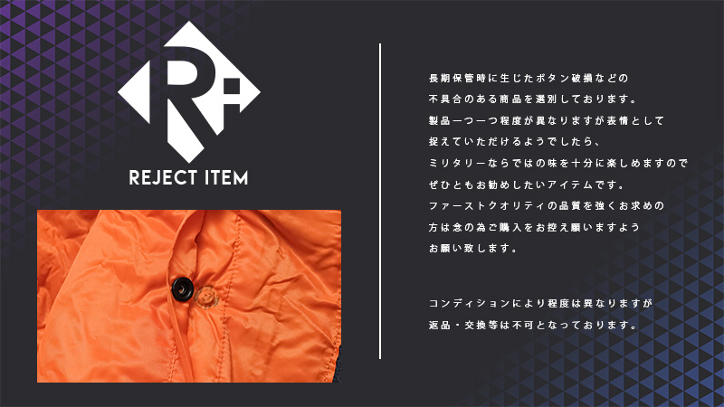 ※長期保管時に生じたボタン破損などの不具合のある商品を選別しております。多少の加水分解や、保管汚れやジップの塗装剥げやがある場合がございます。新品未使用品ではございますが長期保管などに起因する臭いがございます。オキシクリーンなどの洗剤をお湯に溶かし、手洗い、最大で6時間程度つけ置き、洗濯機で脱水後に風通しの良い場所で干して乾かしていただくと効果が期待できます。商品の状態についてご指定いただくことは出来ませんので予めご了承ください。こちらの商品はご購入後の返品・交換は一切お受けできません。予めご了承下さい。