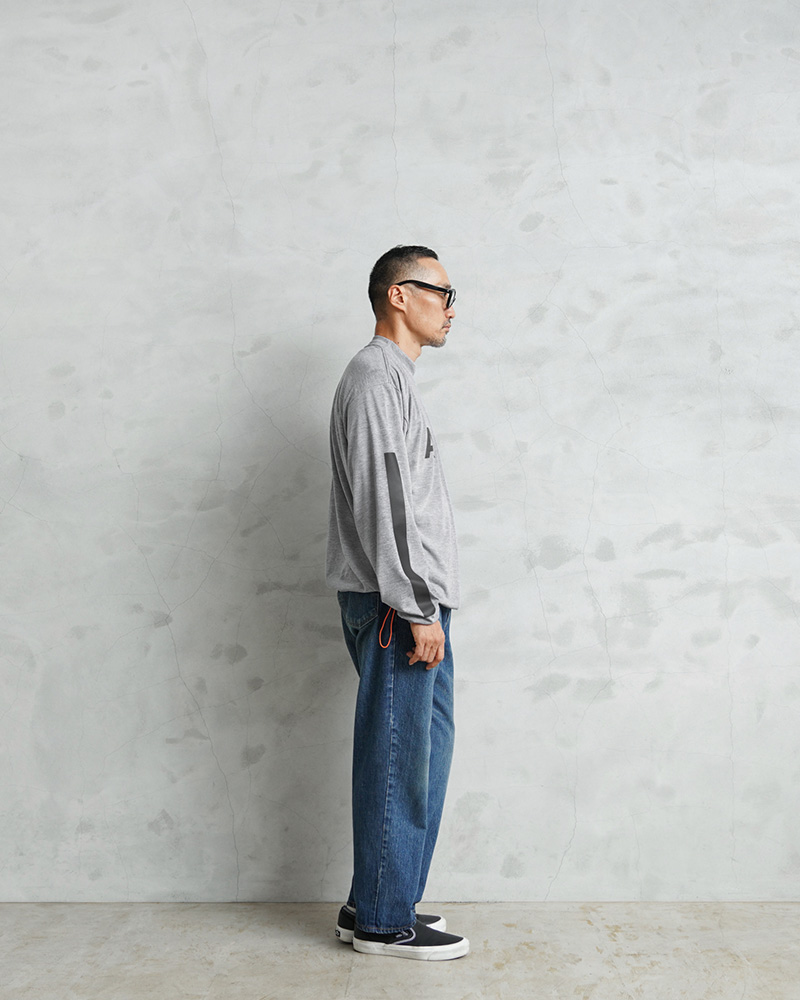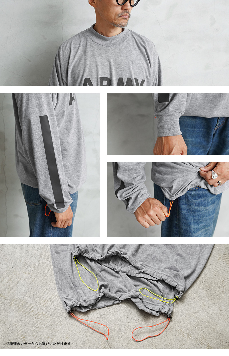 米軍で採用されていたトレーニングTシャツの袖にしっかりと光を反射するリフレクターラインのプリントを追加し、デザイン性と機能性をUP!さらに、着用しやすい着丈にカットし、裾部分の両サイドにネオンカラーのドローコードを配置したリメイクを施し、サイドから見えるコードが良いアクセントになっています。お好みのシルエットや丈感にアレンジするなど、多彩な着こなしがお楽しみいただけます。速乾性に優れ、サラッとした着心地のポリエステル生地を使用しています。体から放出される熱や汗を生地が調整することで寒暖に関係なく快適な着心地を実現しています、とても柔らかく肌触りも良い素材です。