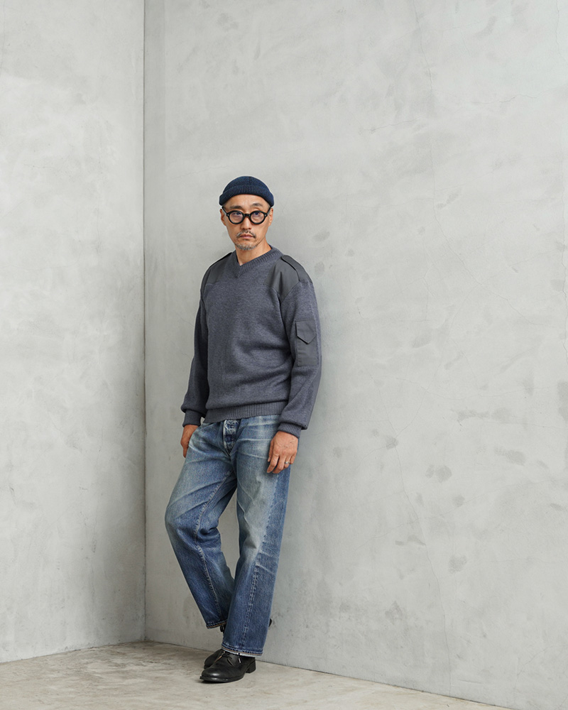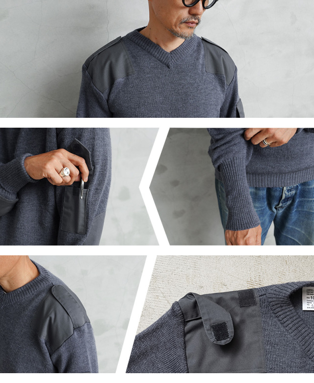 | 商品説明 | 実物 USED イギリス軍 RAF ユーティリティ Vネック コマンドセーター ブルーグレーのご紹介です。 イギリス空軍(RAF=Royal Air Force)で使用されているVネックコマンドセーターが入荷しました! 数あるイギリス軍アイテムの中でも、大定番とも呼べるコマンドセーターですが、陸軍のオリーブ、海軍のネイビーとはまた違う空軍のブルーグレーというカラーが魅力です。ちょうど良い網目のミドルゲージニットが採用された、ウールをメインにナイロンが混紡された浅めのVネックが使いやすいセーターです。 肩や肘などの摩耗しやすい部分にはコットンポリ系のツイル素材で補強がされています。肩のエポレットなどコマンドセーターのディテールに加えて、首元、袖先や裾は編みを変えることで適度なフィット感があるリブが採用されています。 袖口のリブは長めのデザインなので、そのままでも折り返しても使えるディテールになっています。左袖にはペンホルダー付きなのでワンポイントのアクセントになっています。 ウールを多く使用したしっかりと肉厚なニットで保温性に優れ、雰囲気も抜群のミリタリーセーターです。 |