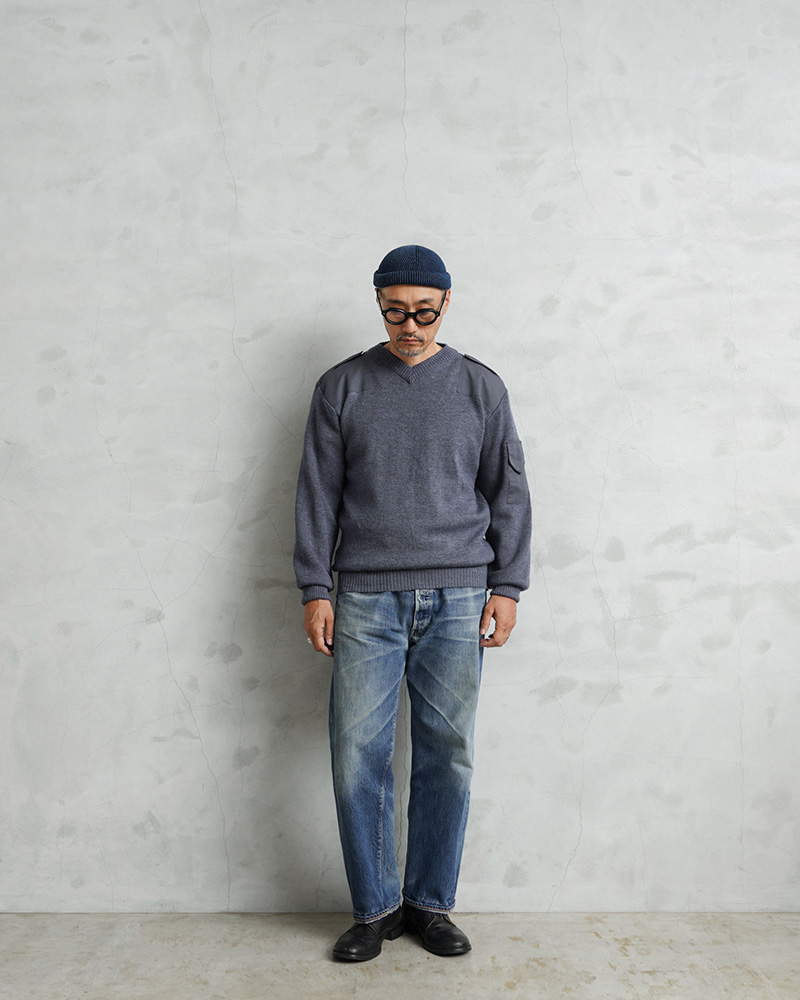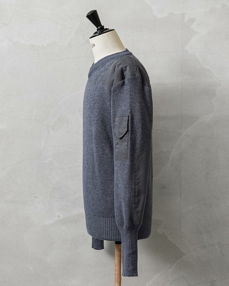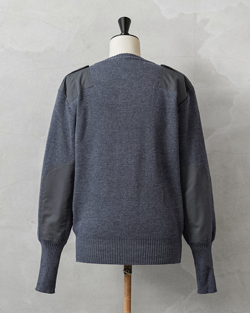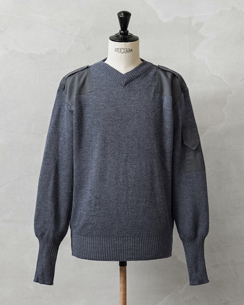 イギリス空軍(RAF=Royal Air Force)で使用されているVネックコマンドセーターが入荷しました!数あるイギリス軍アイテムの中でも、大定番とも呼べるコマンドセーターですが、陸軍のオリーブ、海軍のネイビーとはまた違う空軍のブルーグレーというカラーが魅力です。ちょうど良い網目のミドルゲージニットが採用された、ウールをメインにナイロンが混紡された浅めのVネックが使いやすいセーターです。