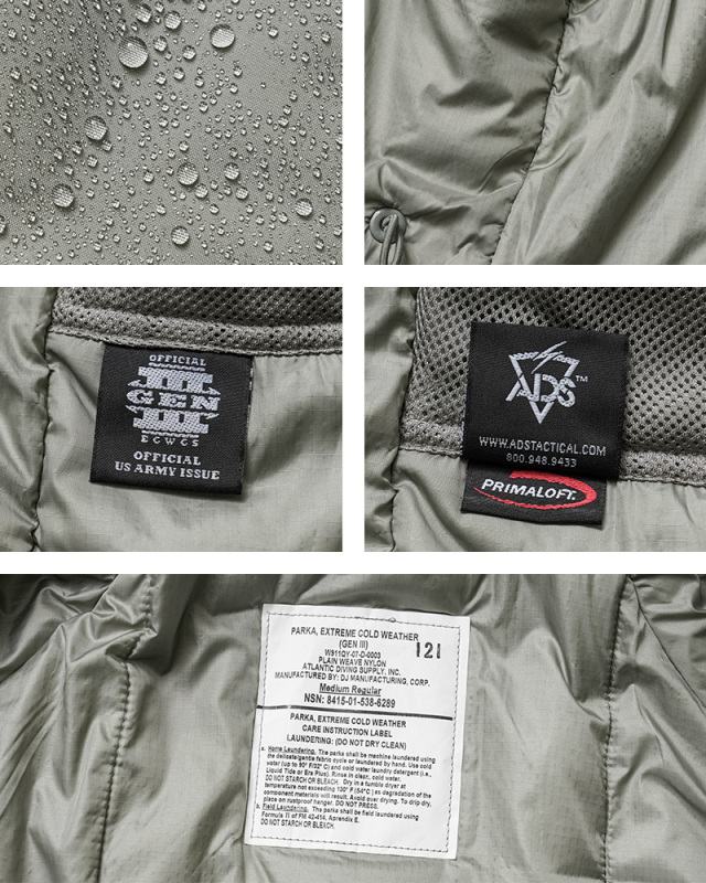 米軍 ECWCS 第三世代(ジェネレーション3)は7種類のトップスと5種類のボトムから構成された、様々な気候やシチュエーションに対応するレイヤリングシステムです。実物本物のLevel 7ジャケットです。しかも、なかなか見かけることの少なくなった未使用デッドストック!コントラクター別に選べるように「DJ MANUFACTURING,CORP.」が製造したアイテムをセレクトしました!このLevel 7はレイヤリング最終防寒アウターとして、中綿にはPRIMALOFT(プリマロフト)を使用。暖かさの点でグースダウンに匹敵し、さらに湿気の存在下でも熱を保持する合成断熱材として広く使用されています。