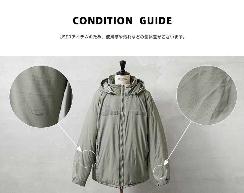 | 商品状態 | 軍放出のUSED ※USEDアイテムのため、使用感や汚れなどの個体差がございます。GEN IIIやプリマロフトのタグがないものも混在しております。商品の状態についてご指定いただくことは出来ませんので予めご了承ください。 |
