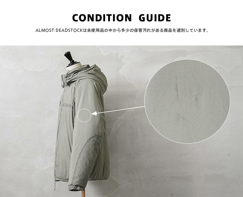 | 商品状態 | 実物新品未使用デッドストック ※コンディションBは未使用品の中から多少の保管汚れがある商品を選別しています。入荷時期によりタグにマジックで線や文字が書いてあるものもございますが、新品未使用品に間違いございません。GEN IIIやプリマロフトのタグがないものも混在しております。商品の状態についてご指定いただくことは出来ませんので予めご了承ください。 |