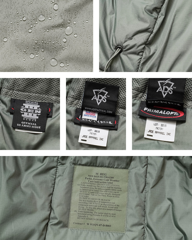 米軍 ECWCS 第三世代(ジェネレーション3)は7種類のトップスと5種類のボトムから構成された、様々な気候やシチュエーションに対応するレイヤリングシステムです。実物本物のLevel 7ジャケットです。しかも、なかなか見かけることの少なくなった未使用デッドストック!コントラクター別に選べるように、「WILD THINGS」が「JADE APPAREL INC」に製造委託を行い、軍に納入された最も人気で価値の高いアイテムをセレクトしました!