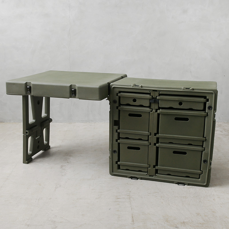 米軍御用達のPELICAN-HARDIGG社(ペリカン ハーディッグ社)による防塵防水、耐衝撃性に優れた折りたたみ式フィールドデスクです。一見、コンパクトな箱のようですが、蓋に付いている足を出して、フックを本体の側面に引っ掛ければ簡単にデスクの組み立てが可能。軍用ならではの頑丈なボディに、机と6個の引き出しがセットされています。また、デッドストックということで折り畳みの椅子も収納されており、すぐにデスクとして使用可能です。無駄のないデザインで、丈夫で持ち出しに便利な仕様。アウトドアやガレージでの活用はもちろん、インダストリアル・アーミースタイルなお部屋にインテリアの一部として取り入れるだけでより本格的な雰囲気を味わうことが出来ます。