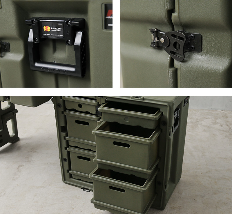 | 商品説明 | 実物 新品 デッドストック 米軍 PELICAN シングル フィールドデスク イス付きのご紹介です。 米軍御用達のPELICAN-HARDIGG社(ペリカン ハーディッグ社)による防塵防水、耐衝撃性に優れた折りたたみ式フィールドデスクです。 一見、コンパクトな箱のようですが、蓋に付いている足を出して、フックを本体の側面に引っ掛ければ簡単にデスクの組み立てが可能。軍用ならではの頑丈なボディに、机と6個の引き出しがセットされています。 また、デッドストックということで折り畳みの椅子も収納されており、すぐにデスクとして使用可能です。 無駄のないデザインで、丈夫で持ち出しに便利な仕様。アウトドアやガレージでの活用はもちろん、インダストリアル・アーミースタイルなお部屋にインテリアの一部として取り入れるだけでより本格的な雰囲気を味わうことが出来ます。 古くからや警察など政府関係を中心に丈夫なコンテナケースを納めていたHARDIGG社とPELICAN/ペリカン社の合併後に作られたモデルで、堅牢かつ無骨で、機能的なデスクです。 ※商品が大きく重量があるため、個別送料(9,500円(税込))を設定させて頂いております。 同時に他の商品をご注文頂いた場合、またこちらデスク数点のご注文に関しましても1点につき個別送料(9,500円(税込))をご負担頂きます。 ※沖縄県につきましては、別途料金の適用となります。また、一部離島については、別途中継料のご負担をいただく場合がございます。 |