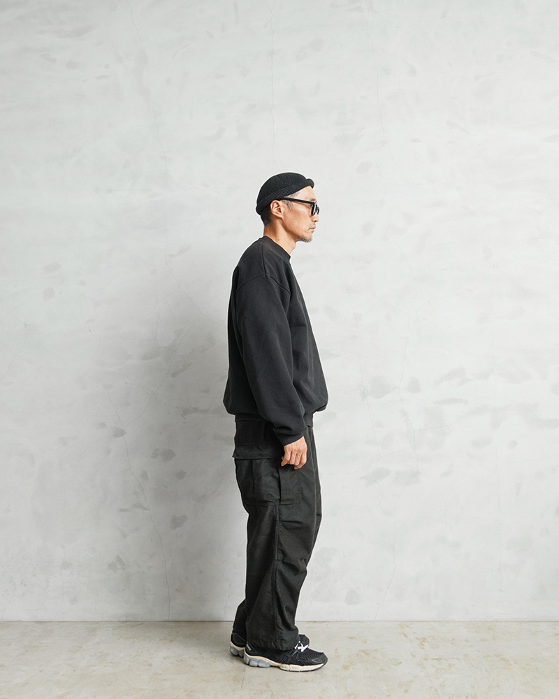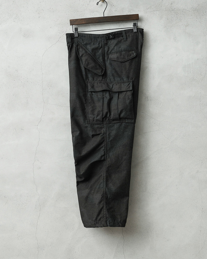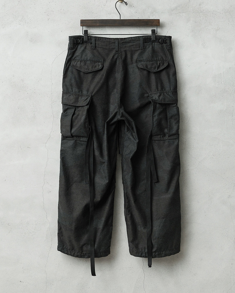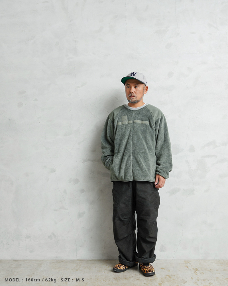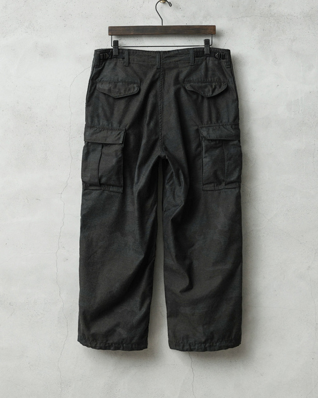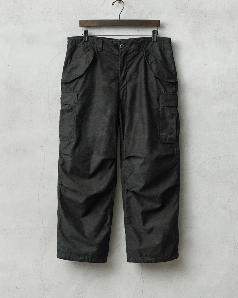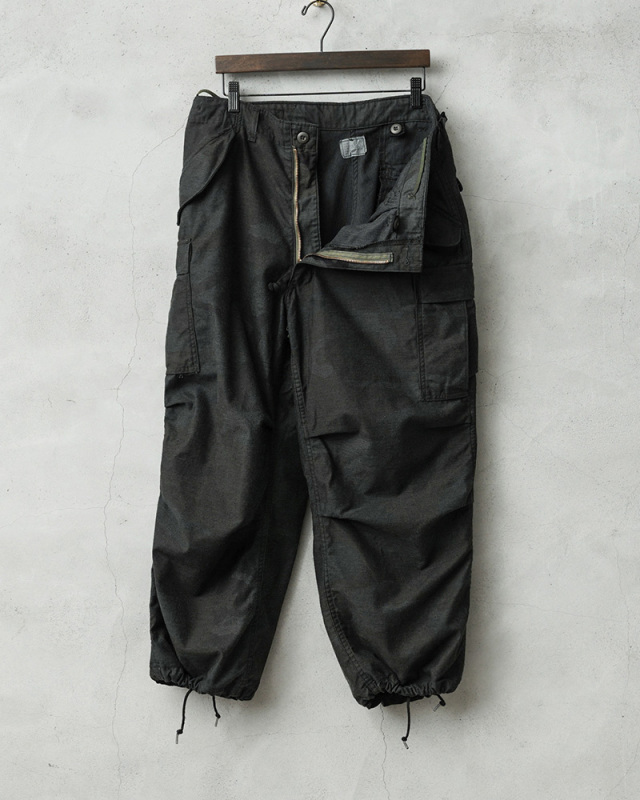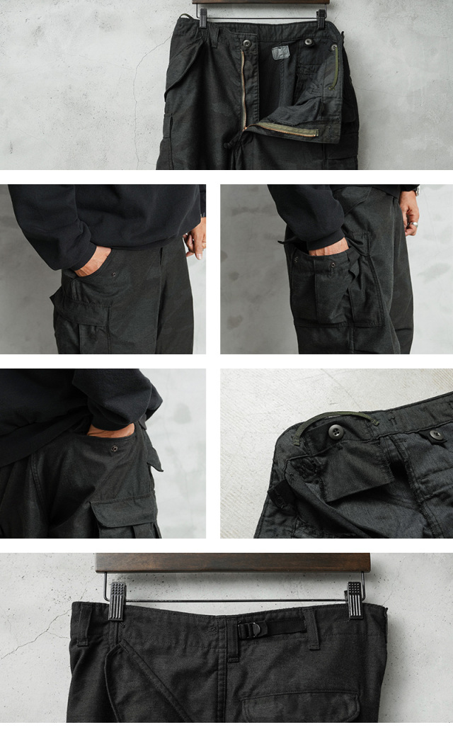 | 商品説明 | 実物 新品 米軍 M-65フィールドカーゴパンツ ウッドランド迷彩 BLACK染め M-Sサイズのご紹介です。 制式名称:TROUSERS,COLD WEATHER,FIELD 米軍で1965年に採用されたフィールドカーゴパンツは現在ではデッドストックはもとより、USEDでさえも放出されることが無くなっているカーゴパンツのルーツを辿るには外せない希少な名作トラウザーズです。1981年から2005年頃まで米軍で採用されていたウッドランド迷彩柄です。 こちらはその中でも一番着用しやすいMedium-Short。数あるサイズバリエーションの中でも、これから一番のレアピースになって行くと思われるグッドサイズです。 特殊な染色を行い深くしっかりとブラックに染まったDEEP BLACKとは違い、元の迷彩柄を残すように製品染めを施し、オリジナルのウッドランドデザインを通常とは違うシックな雰囲気で楽しめる1本となっております。 寒冷地で使用する際に中綿入りのキルティングライナーパンツをセットで装着するために多少ゆったりとしたシルエットでデザインされていますが、ライナーを使用しないのであればリラックスフィットで着用できるシルエットのカーゴパンツです。素材にはコットンナイロン混紡のバックサテンが使用されており、ドライタッチな素材感。耐風性にも優れた丈夫な質感のカーゴパンツです。 ウエストにはアジャスター付きでベルトなしでも着用できる仕様で、フラップ付きのサイドポケットとバックポケットは左右に2箇所づつ設けられており、ウエストの内側にも小型のウォッチポケットが備わっています。 マチ付きで大型のカーゴポケット内にはタイコードと呼ばれるカーゴポケットのサイドから引き出して使用するストラップが付属しています。怪我をした際の止血や、クロッチ部分のループに通してカーゴポケットを縛ることで収納物の音を立てないようにするための目的で付けられている特徴的なディテールです。 膝部分には膝を曲げた際に突っ張らないように2箇所のタックが入れられています。裾にはドローコード付きで絞って着用することでシルエットに変化を持たせて着用できます。細部にまで様々な画期的な機能が追加され、多くのブランドがリプロダクトしている点を見ても、服飾史に於いて重要なカーゴパンツと言えます。 近年では出回ることが非常に少なくなった未使用のデッドストック品を贅沢に使用しています。あるうちに手に入れておきたいミリタリーアイテムの1つです! |
