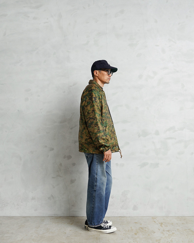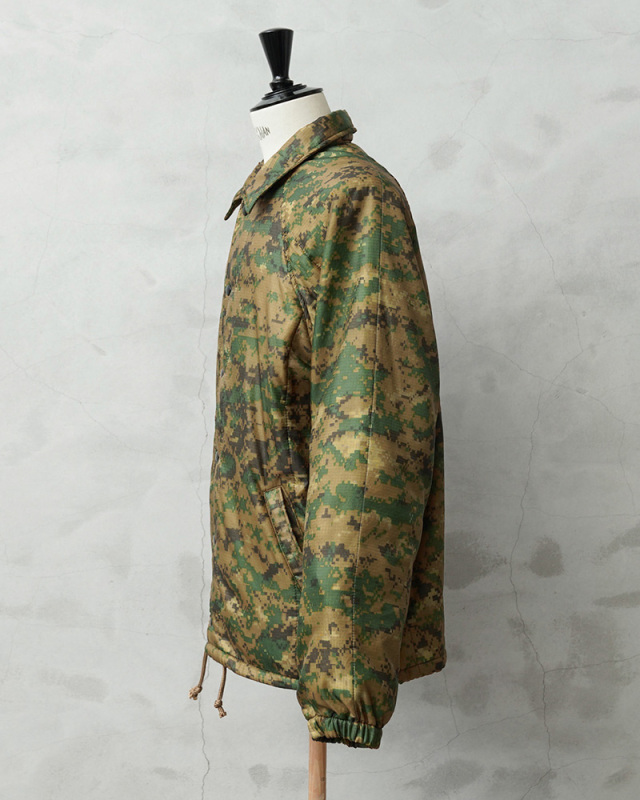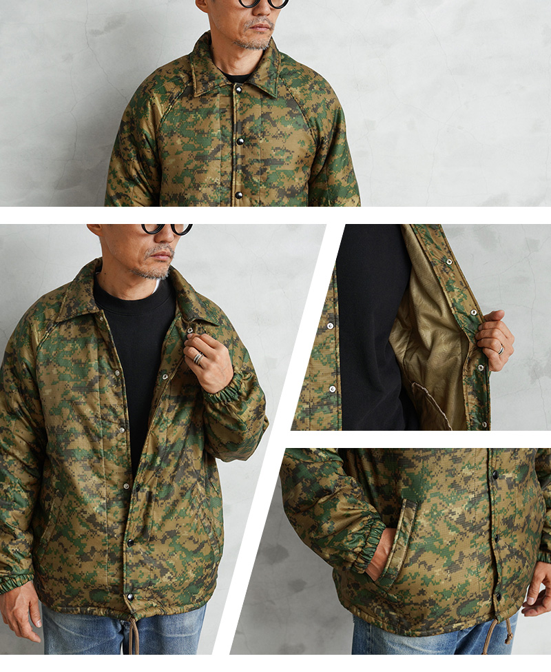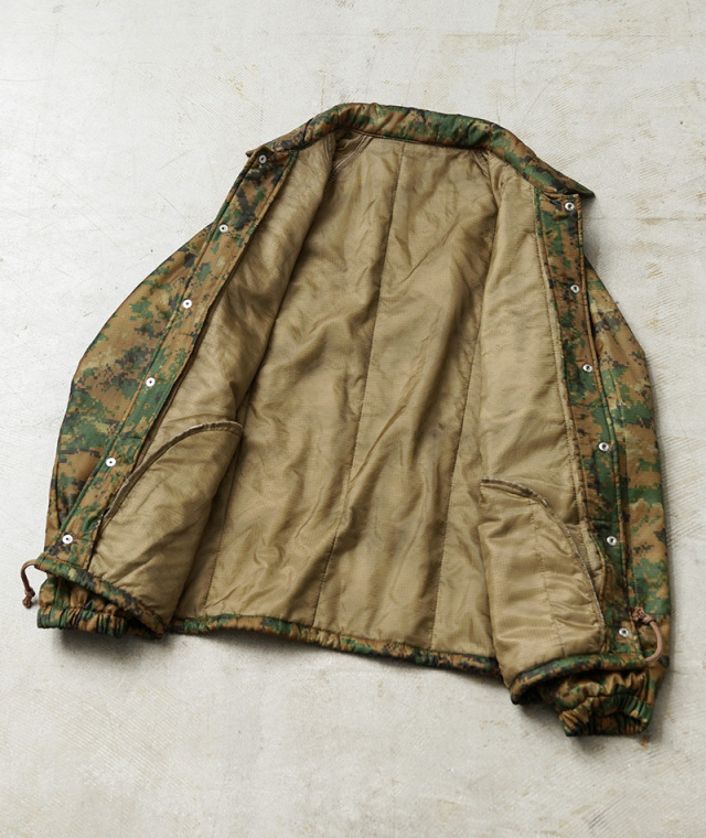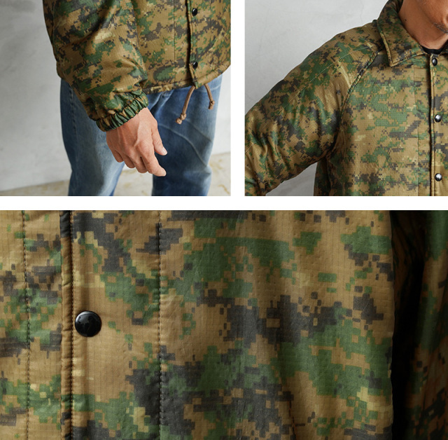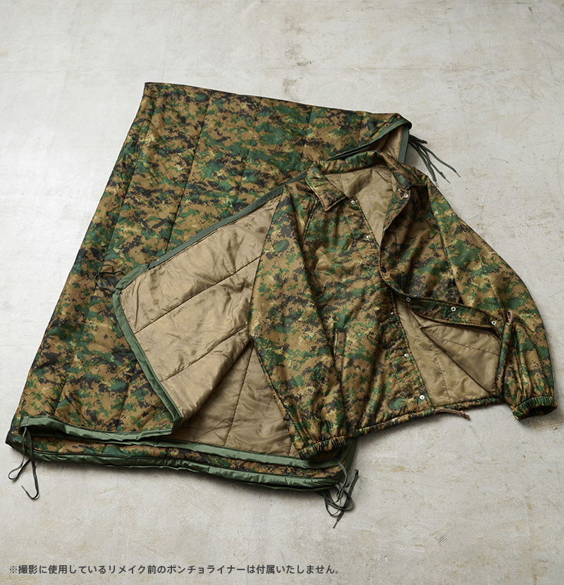 WAIPER.incで米海兵隊のポンチョライナーを使用し、軽くて保温性に優れたコーチジャケットを製作しました!肌触りの良いキルティング素材で、非常に着心地もよい一着となっております。MARPAT側のポンチョライナーを素材とし、キルティング素材をそのまま大胆にアウターの素材に使用しました。ポンチョライナーとしても、価格がかなり高騰しているアイテムの未使用デッドストックを惜しみなく使用した完成度の高い仕上がりです。MARPATのデジタル迷彩がインパクト大で、ブラックのスナップボタンで開閉、ラグランスリーブが採用されていますので肩や腕が動かしやすく、綺麗な落ち感で動きやすくデザインされています。ウエスト部分にはハンドウォーマーポケットを配置しています。