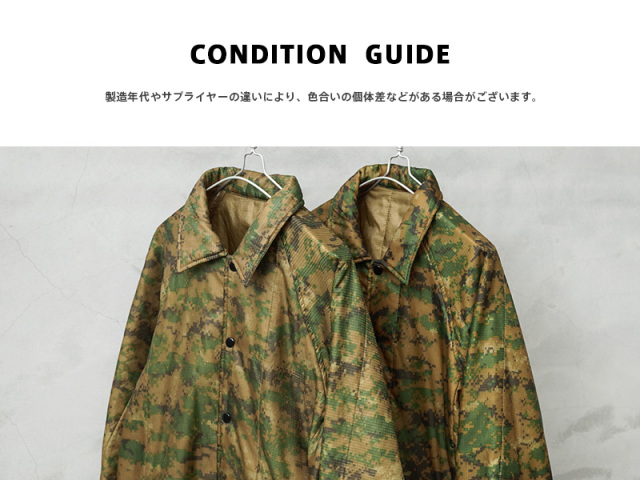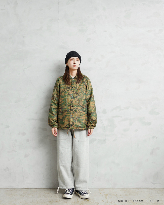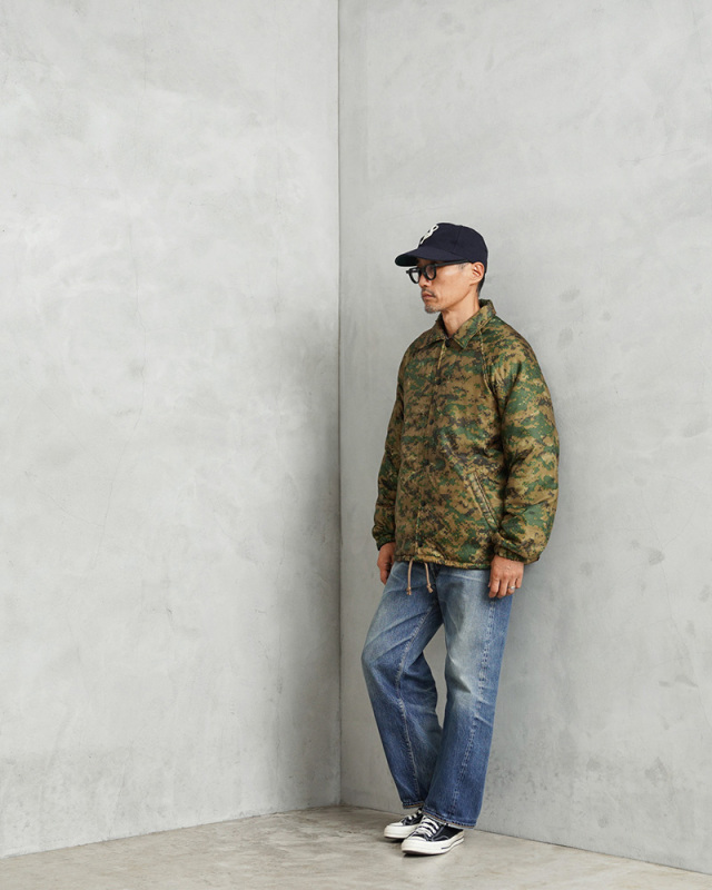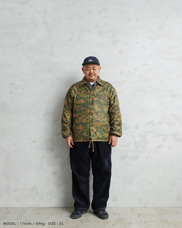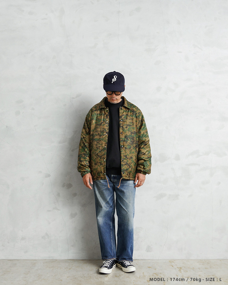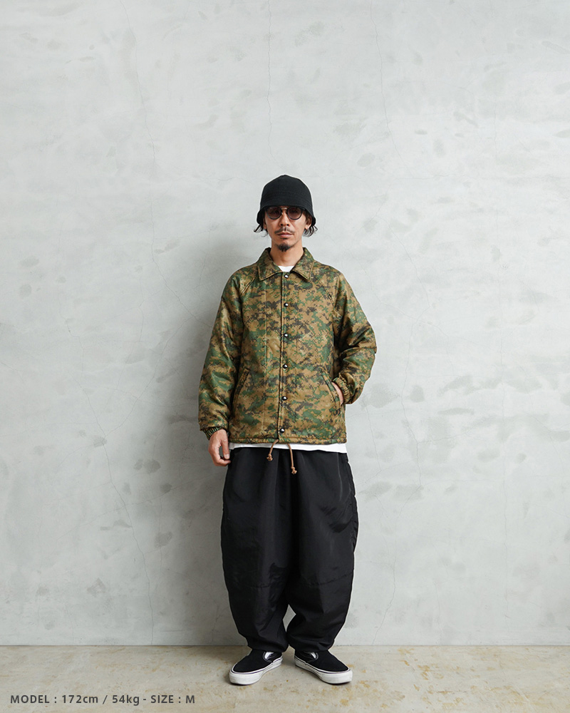 WAIPER.incで米海兵隊のポンチョライナーを使用し、軽くて保温性に優れたコーチジャケットを製作しました!肌触りの良いキルティング素材で、非常に着心地もよい一着となっております。MARPAT側のポンチョライナーを素材とし、キルティング素材をそのまま大胆にアウターの素材に使用しました。ポンチョライナーとしても、価格がかなり高騰しているアイテムの未使用デッドストックを惜しみなく使用した完成度の高い仕上がりです。MARPATのデジタル迷彩がインパクト大で、ブラックのスナップボタンで開閉、ラグランスリーブが採用されていますので肩や腕が動かしやすく、綺麗な落ち感で動きやすくデザインされています。ウエスト部分にはハンドウォーマーポケットを配置しています。