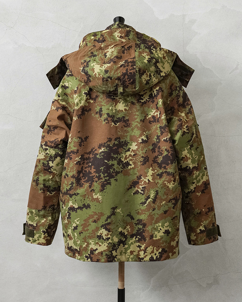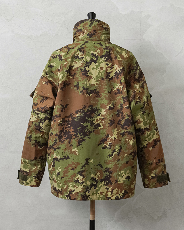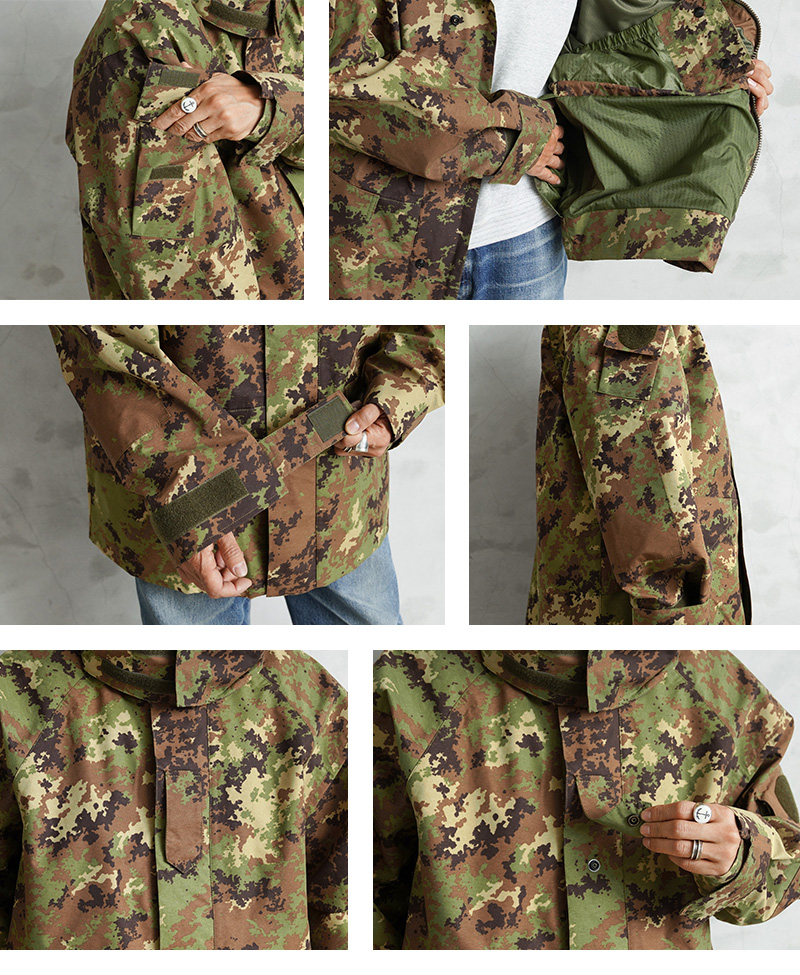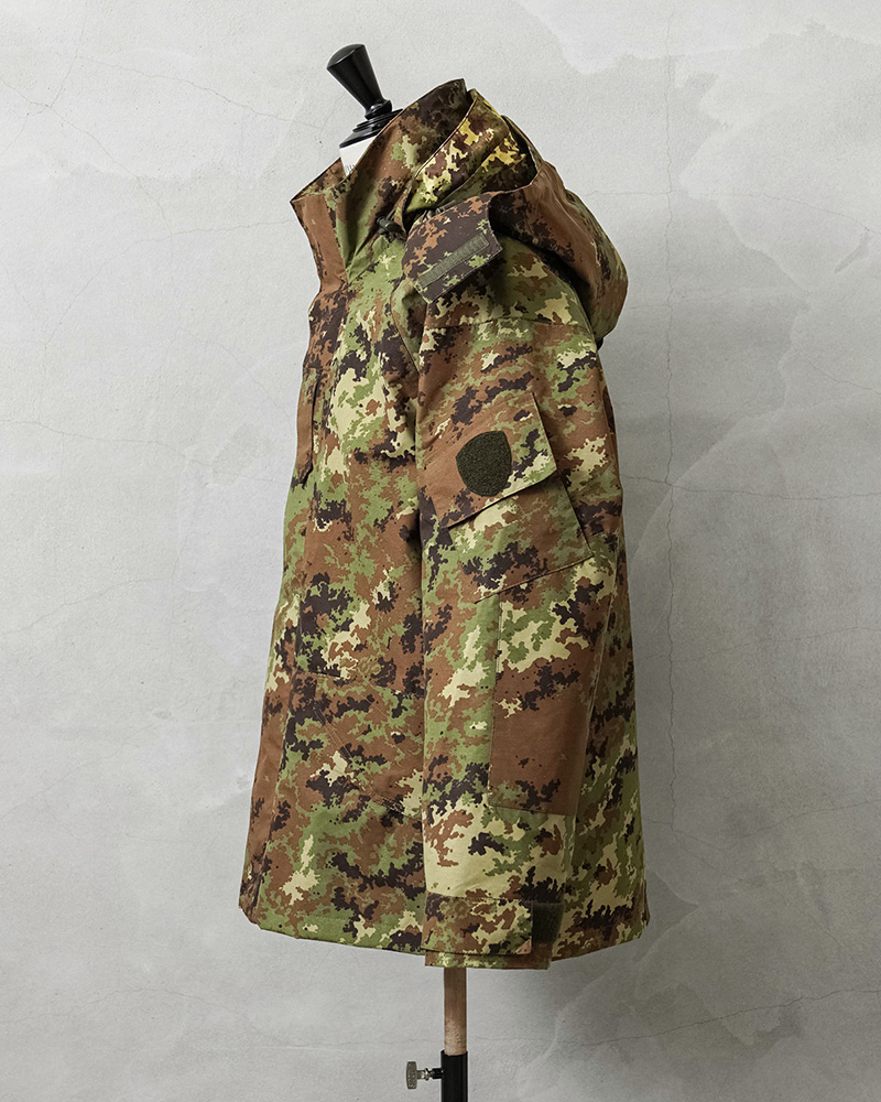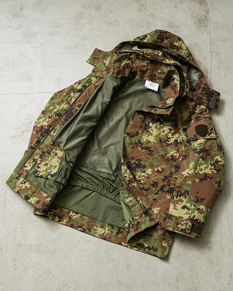 イタリア軍で2000年代以降に採用された透湿、防水、撥水性に優れたジャケットが入荷しました!ベジタトカモを使用したフィールドパーカーはGORE-TEX(ゴアテックス)にも匹敵する性能を持つ素材を採用しており、内側の蒸れは逃がしつつ、外からの雨風はしっかりブロック。水滴は通さない事でドライな状態を保ち、風を通さないことで保温性も向上させる高機能素材の透湿性防水生地を使用しています。一般的なGORE-TEXジャケットは裏地がそのまま見えていることが多いのですが、このジャケットはメッシュやリップストップの裏地が付けられていますので、より快適に使用できるようにデザインされています。