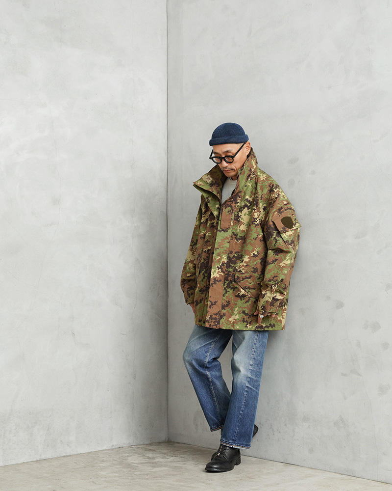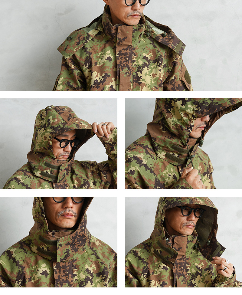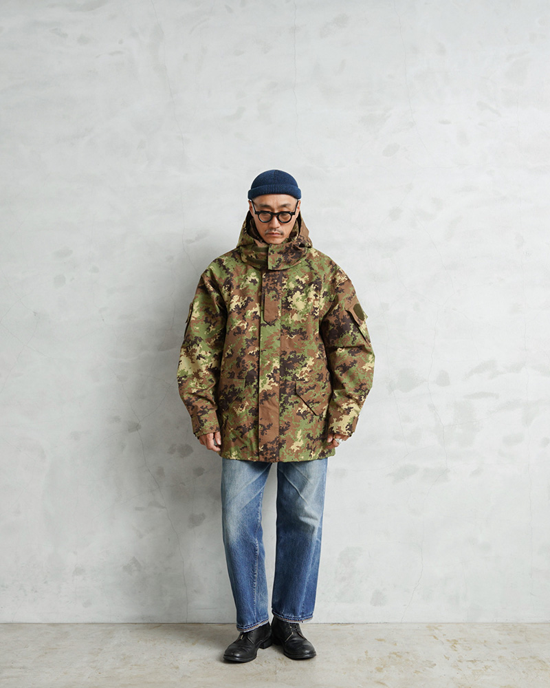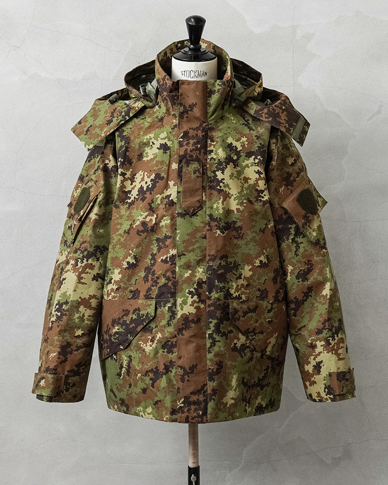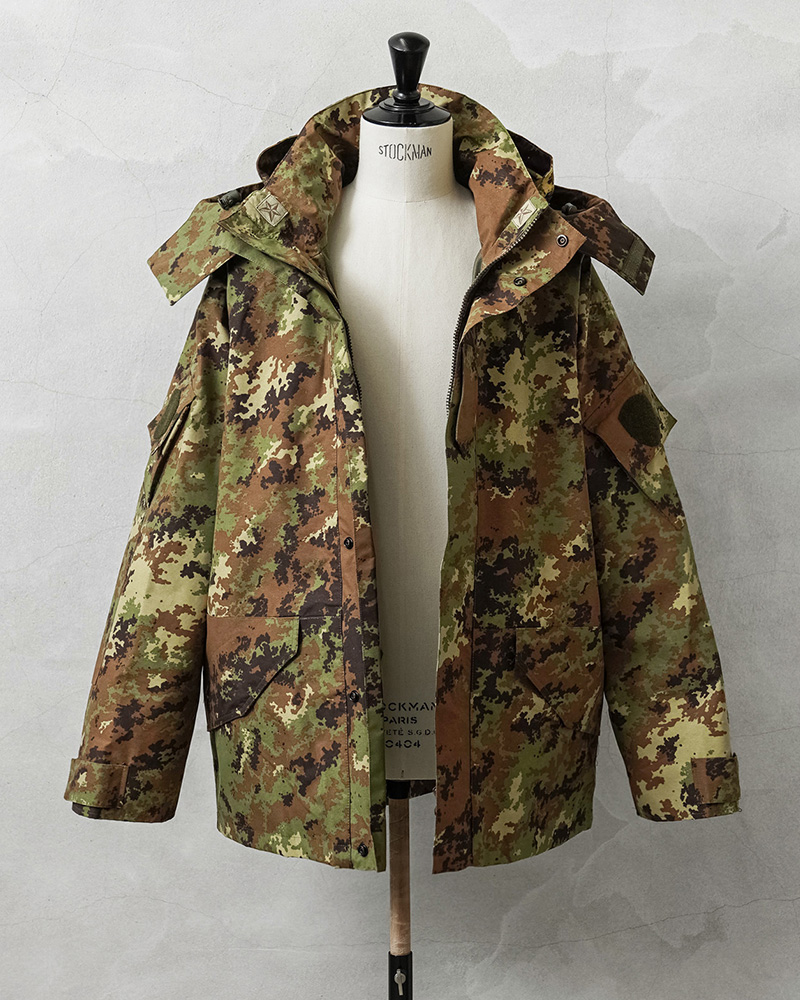 イタリア軍で2000年代以降に採用された透湿、防水、撥水性に優れたジャケットが入荷しました!ベジタトカモを使用したフィールドパーカーはGORE-TEX(ゴアテックス)にも匹敵する性能を持つ素材を採用しており、内側の蒸れは逃がしつつ、外からの雨風はしっかりブロック。水滴は通さない事でドライな状態を保ち、風を通さないことで保温性も向上させる高機能素材の透湿性防水生地を使用しています。一般的なGORE-TEXジャケットは裏地がそのまま見えていることが多いのですが、このジャケットはメッシュやリップストップの裏地が付けられていますので、より快適に使用できるようにデザインされています。