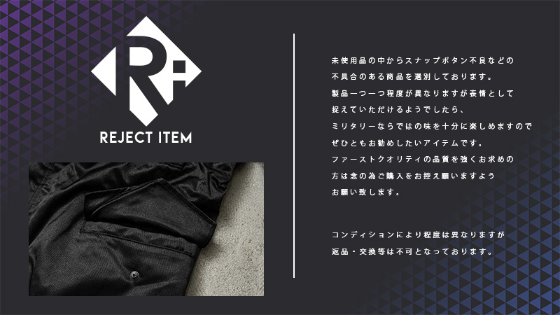 | 商品状態 | 新品未使用デッドストックのリジェクト 未使用品の中からスナップボタン不良などの不具合のある商品を選別しております。商品の状態についてご指定いただくことは出来ませんので予めご了承ください。こちらの商品はご購入後の返品・交換は一切お受けできません。予めご了承下さい。 |