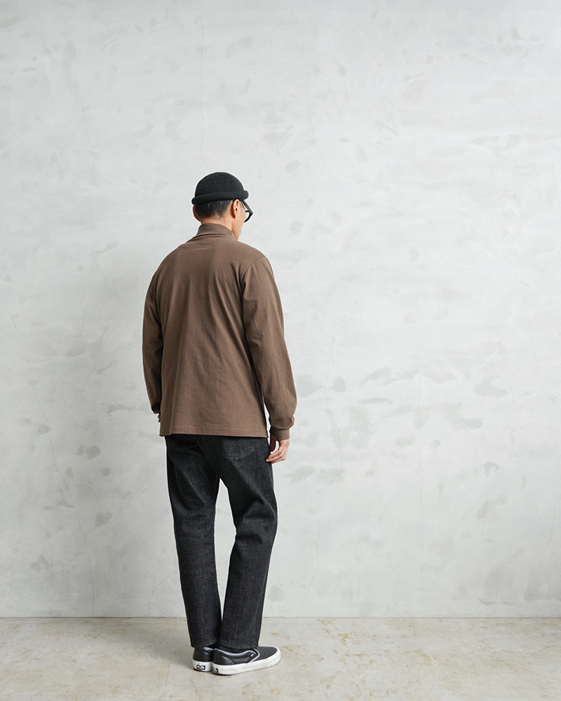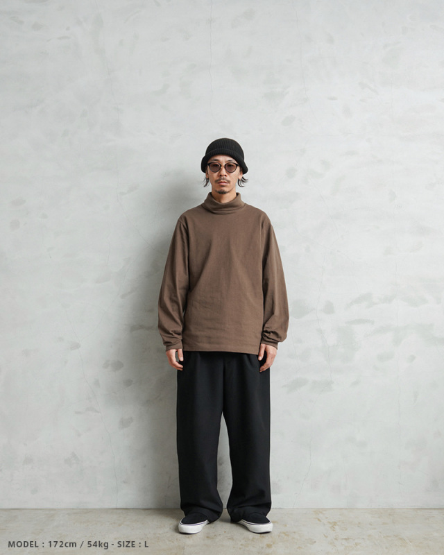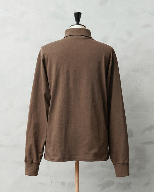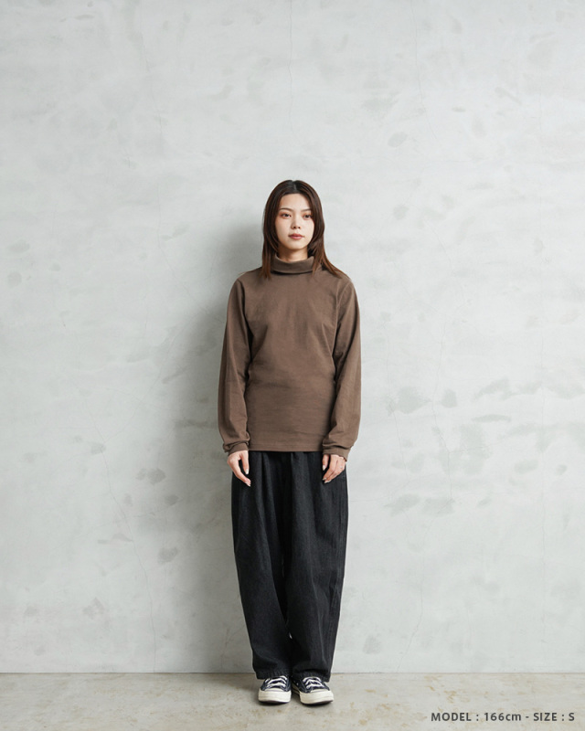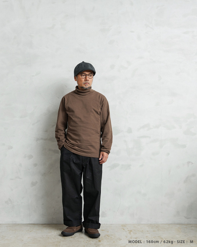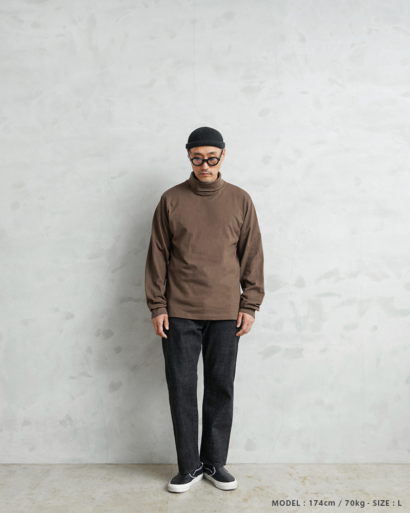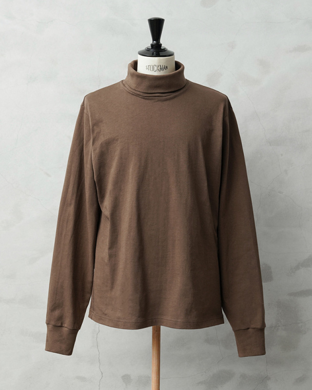 首元は1回折り返すとベストなタートルネックで、サイドにスリットの入ったロングテールデザインの裾をカットし、スクエアテールにすることで自然体で着れるアイテムにリメイクを施しました。程よく厚手でUSAコットンのようなドライ感のあるさらっとした肌触りのコットン100%素材を使用しており、首元と袖先はリブ仕様で適度にフィットします。ブラウンは航空団の機長と航空機の出撃準備や機体の維持を行う航空団の下士官の担当する部署となりますが、ファッション的にもコーディネートがしやすいカラーで落ち着いた印象を与える長袖Tシャツです。性別を問わず、1枚でもレイヤードでも色々な着こなしが楽しめるなかなか無いデザインもポイントで、新品で放出されることも少ない希少価値も高いアイテムです。