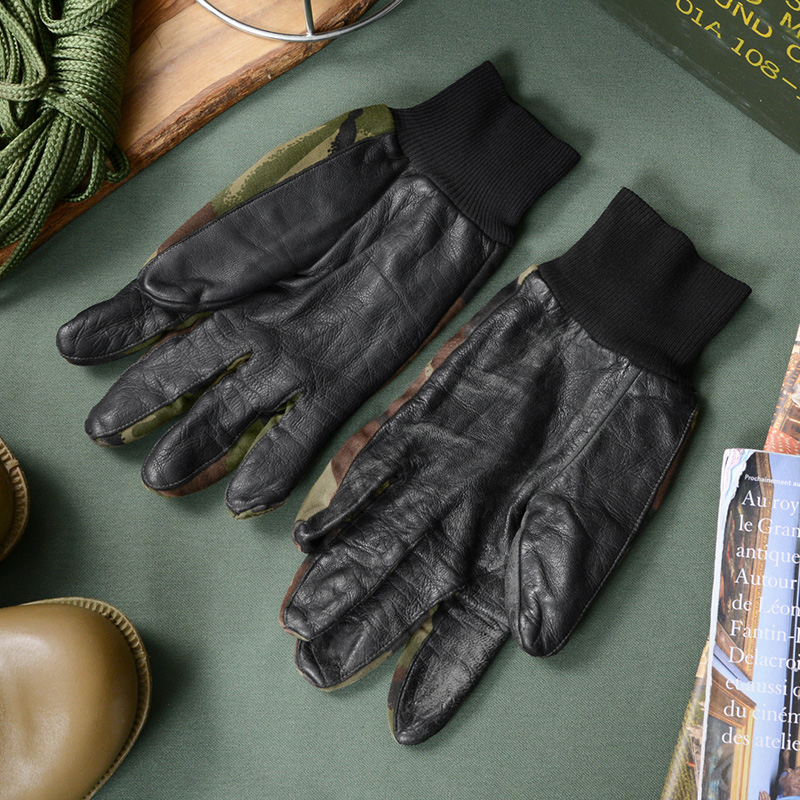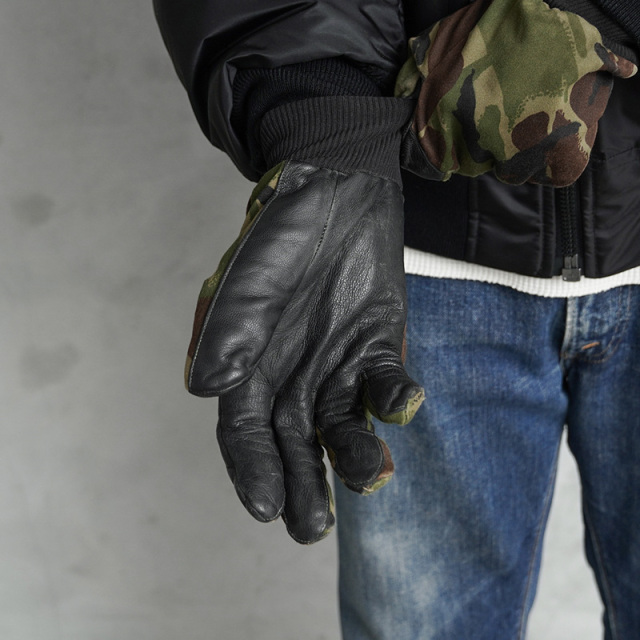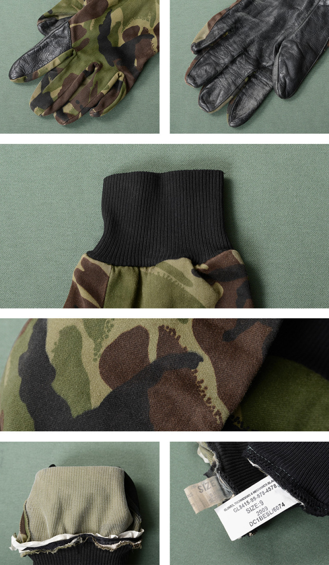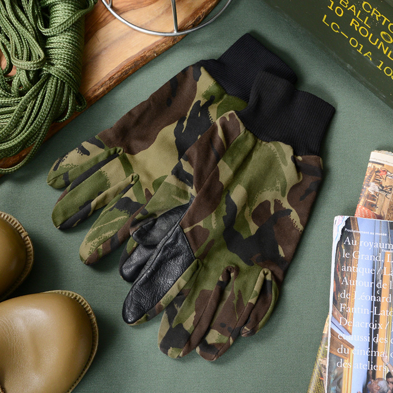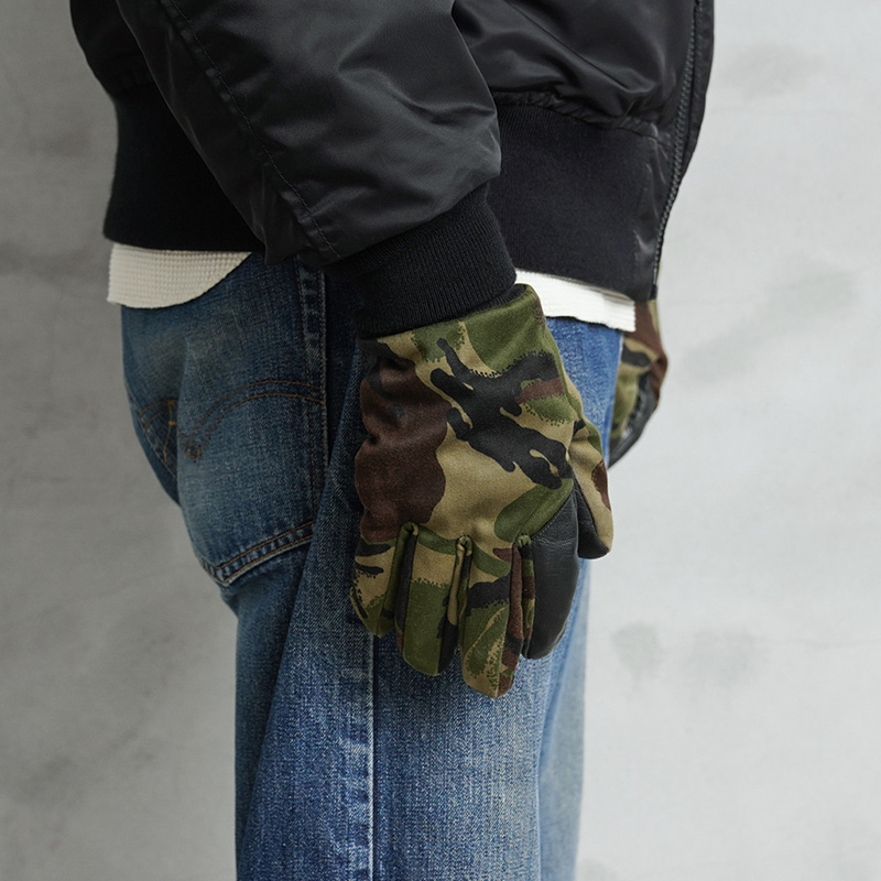 イギリス軍で技術者や整備士がメンテナンス時などに使用するグローブです。人差し指と手のひらには柔らかくグリップ力にも優れたレザーが使用されています。DPMカモ柄の部分はコットンポリ系のツイル素材が使用されています。手首はフィット感のある長めのリブ付きのデザインです。DPMカモ(Disruptive Pattern Material)は、1960年代にイギリス軍全体へ向けて採用されました。2010年にMTP(Multi Terrain Pattern)が導入されるまで使用されていた長い歴史を誇った迷彩柄です。ありそうでないDPMカモのグローブはファッションのアクセントとしても活躍します。