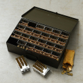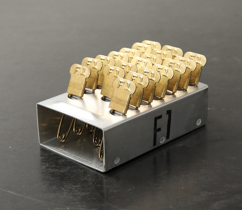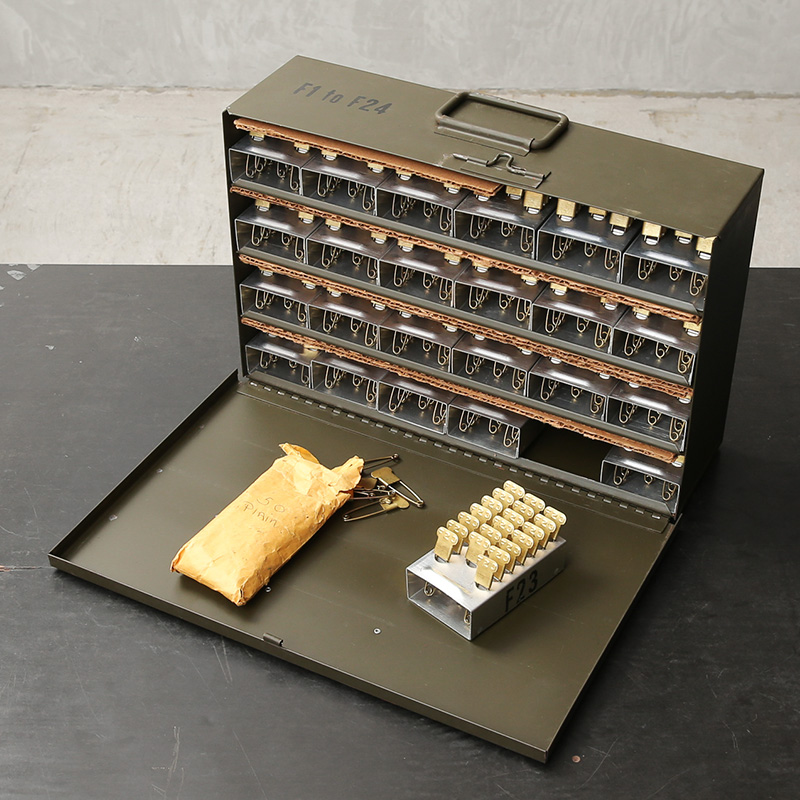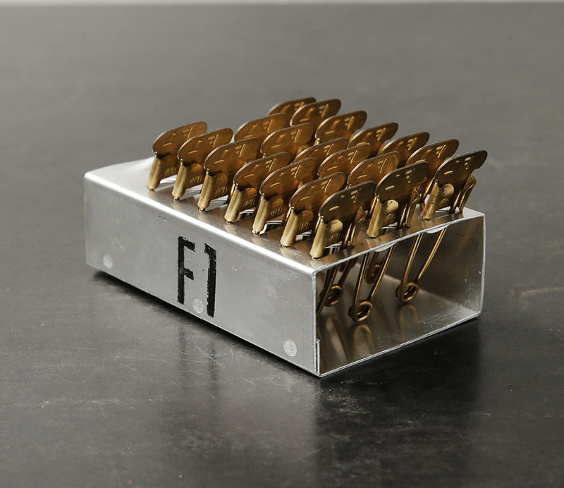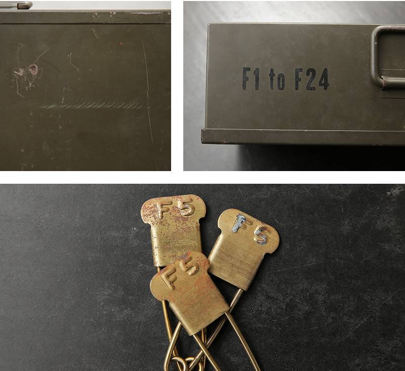 米軍内で洗濯物を識別する為に使われていたセーフティピンの希少なケース付きフルセットが入荷しました。こちらはKEYES DAVIS社製造の個体で年代は1980年代~90年代ごろのものになります。ピンは真鍮製で、その丈夫さから多くの兵士がキーホルダー代わりにしていたといわれるほど雰囲気の良い逸品。分隊(10人くらいの陸軍での最小編成)ごとにナンバリングを変えて識別していたそうで、それぞれのピンには数字とアルファベットのエンボス加工が入っています。アルミ製の格納ケースに20本のピンを1ブロックとして、24個のブロックが収められており、予備用の無刻印のピン50本も完備。