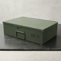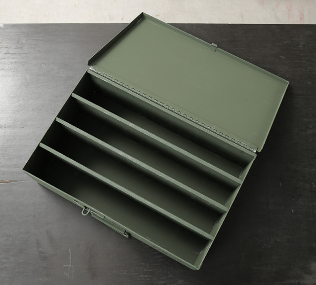 1970年代~1980年代頃米軍内で、洗濯物を識別する為に使われていたセーフティピンの希少なケースが登場。本来はアルミ製の格納ケースに20本のピンを1ブロックとして、24個のブロックが収められているため、四列の仕切りが設置。スチール製で非常に丈夫で、アンモボックスのようなミリタリーものらしい無骨な趣を兼ね備えています。シンプルですが機能的で、存在感抜群。道具入れや、ちょっとした小物の収納箱として、インダストリアル・ミリタリーティストのお部屋にインテリアの一部として取り入れるだけでより本格的な雰囲気を味わうことが出来るアイテムです。