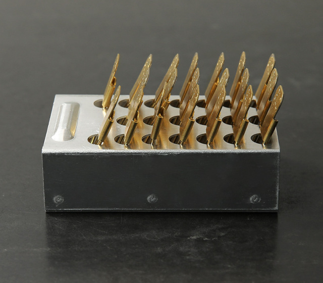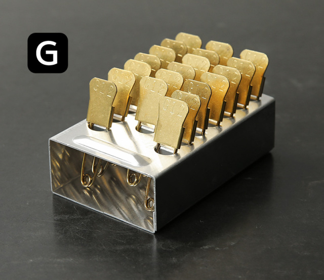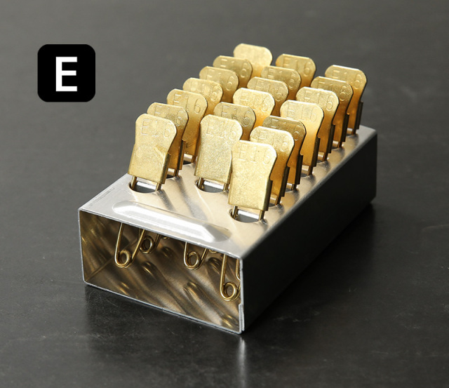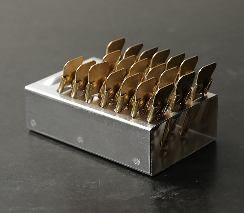 1970年代~1980年代頃米軍内で、米軍内で、洗濯物を識別する為に使われていたセーフティピンのブロックセットが入荷しました。本来はアルミ製のケースに20本のピンを1ブロックとして、24個のブロックで収められていますが、こちらは1ブロック単体(ピン20本)での販売となります。ピンは真鍮製で、その丈夫さから多くの兵士がキーホルダー代わりにしていたといわれるほど雰囲気の良い逸品。分隊(10人くらいの陸軍での最小編成)ごとにナンバリングを変えて識別していたそうで、それぞれのピンには数字とアルファベットの刻印が入っています。20本のピンを収納するための格納ケースはアルミ製になっています。