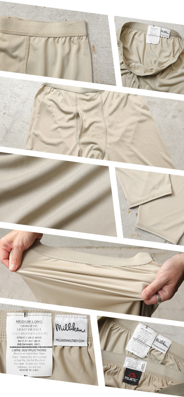 米軍より放出された高性能で肌触りの良いアンダーパンツです。ECWCS 第三世代(GEN III)は7種類(Level 1~Level 7)のトップスと5種類のボトムから構成された、様々な気候やシチュエーションに対応したシステムです。こちらのアンダーパンツは最初のレイヤーであるLevel1のアイテムでベースレイヤーの中でも最も薄手の素材となります。生地は、通気性、速乾性に優れた特殊素材を使用。シルクのような滑らかで気持ちの良い手触りと伸縮性が特徴で、大きく開脚した際の突っ張り感を解消するガゼットクロッチや、肌への違和感が少ないフラットシームを採用するなど機能性に優れています。 ウエストは伸縮性に優れたゴムで柔軟にフィットし、全体的にもボディラインにフィットすることで無駄なだぼつきがなく、重ね着しても動きやすいため登山やキャンプなどのアウトドアに最適です。