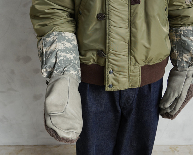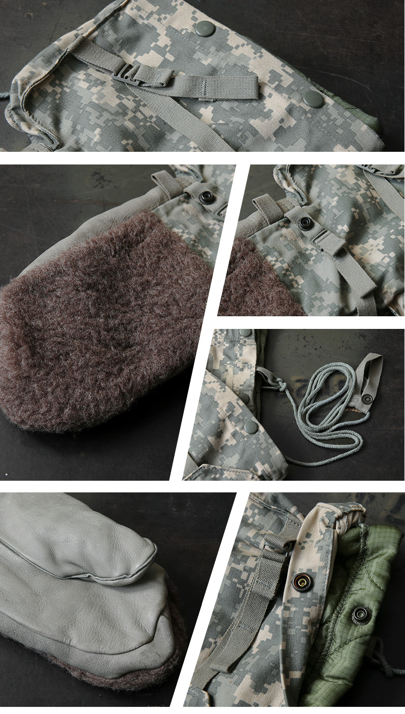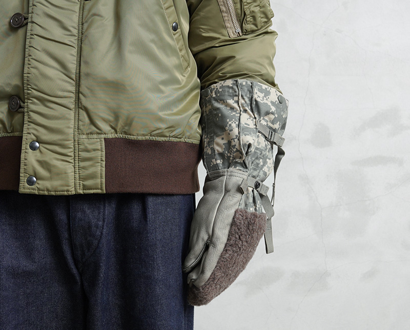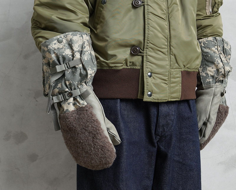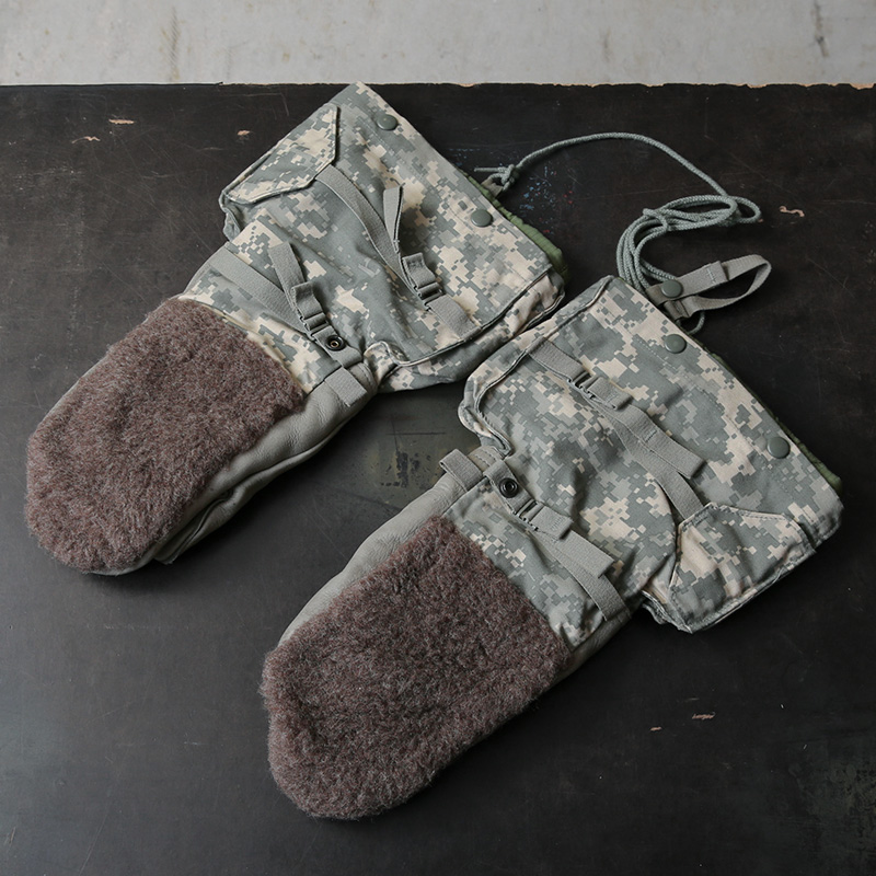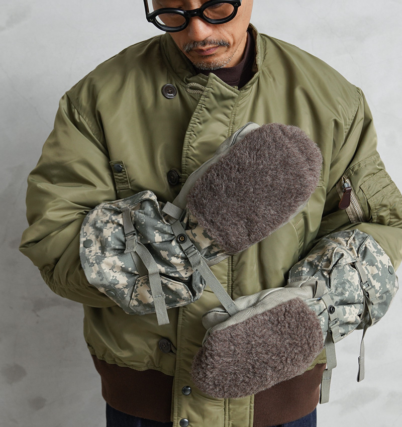 アメリカ軍放出の見るからにタフな装いの極寒地用ミトングローブが登場。手のひらはレザー、手の甲には起毛したボア素材、手首周りは丈夫なM-65フィールドジャケットと同様の生地が使われており、中には取り外し可能なキルティングライナーグローブが付属しています。厳しい寒さに耐えるため防寒性、機能性はもちろんのこと、見た目にも非常にインパクトのあるアイテム。コレクションをはじめ、アウトドアや雪かきなどの冬仕事のお供として、ミリタリーアイテムならではの独特なデザインを楽しめる防寒ミトングローブです。
