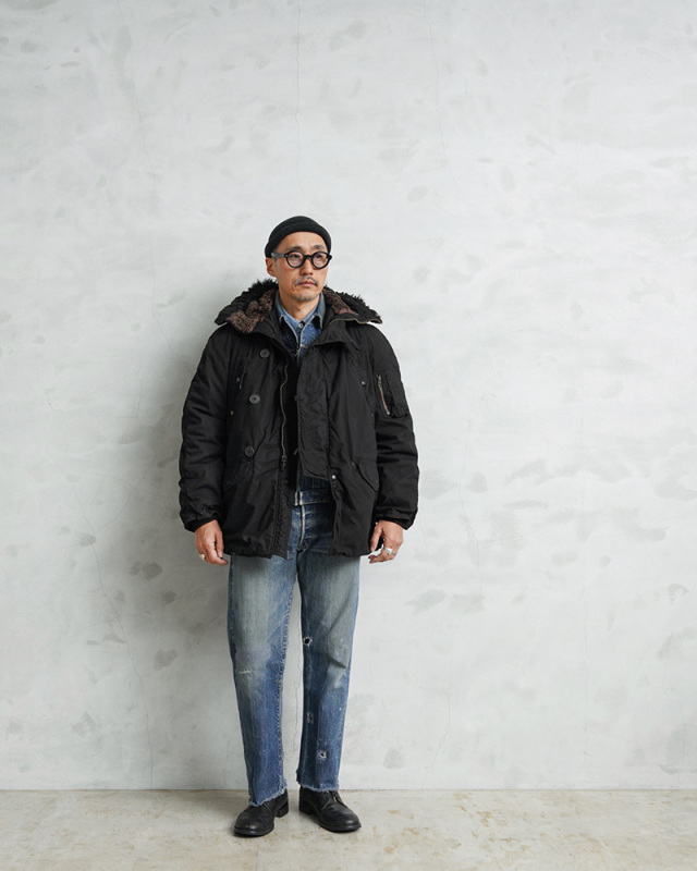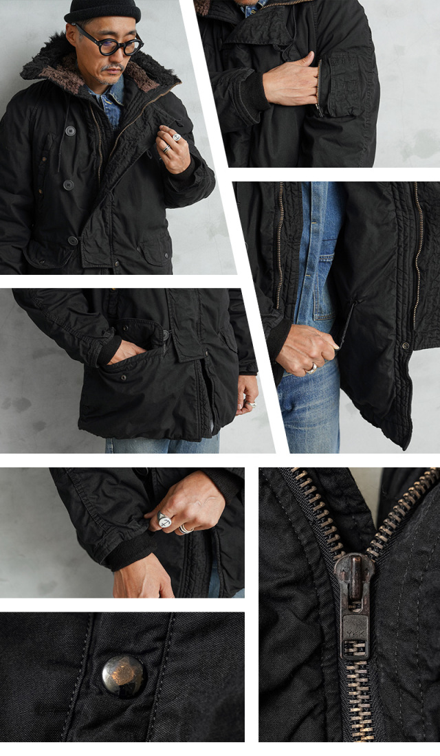 | 商品説明 | 希少 実物 USED 米軍 N-3B フライトジャケット ブラックファー DEEP BLACK染めのご紹介です。 制式名称:PARKA,EXTREME,COLD WEATHER TYPE N-3B ここ数年、現地買付でもほとんど出なくなり、高騰が激しい希少なデッドストックの米軍N-3Bジャケットを贅沢にDEEP BLACK染めを施しました!ナイロンを含む素材は、真っ黒に染めることが難しい素材ながら、特殊な染色を行うことで、通常の製品染めに比べても深くしっかりと染まったDEEP BLACK仕様となっています。ホワイトのファーもブラックに仕上がり、存在感のあるカラーに染まり上がっています。 ミリタリーヴィンテージウェアの代表格で、近年、ミリタリーの防寒性が高いアウターと言えばLevel 7ですが、それともまた違う昔からの防寒アウターとして、ミリタリー界最高峰の優れものです。いつの時代にも古くならないこのデザインは不変的で、まさに王道のアイテムだと思います。 通常アラスカンジャケットと言われ、極寒地で着用出来るように作られています。フード部分のファーは吹雪でも前が見え、耐えられる様に工夫されていますし、表地は風を通さないように、そして中綿は保温性の高い素材が使われています。 手袋着用で手を入れることが多い為、フラップポケットは大きめで使いやすい縦に入れるタイプが2つ、その上に大き目のハンドウォーマーポケットが2つ備わっています。前合わせは2重になり、フロントファスナーに加えてボタン留めになっています。ボタンも手袋をしたままで留めやすいように大きめで、全て機能的に使いやすく工夫されています。実物のN-3BをDEEP BLACK染めにした贅沢すぎる一着です。 着ることで風合いと雰囲気がより増していくレアピースです! |