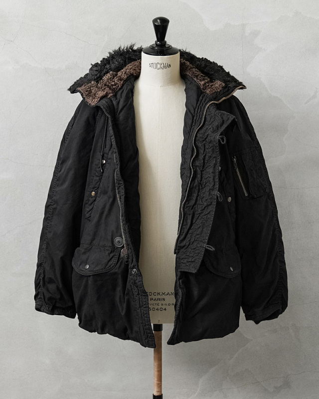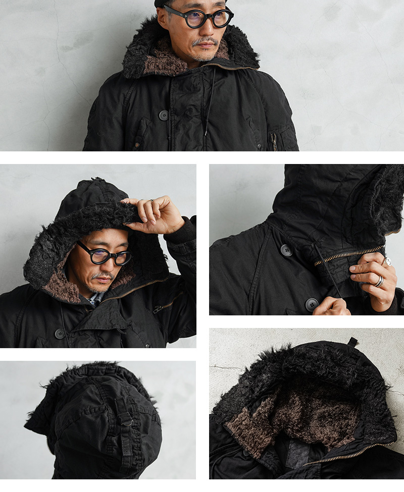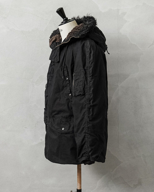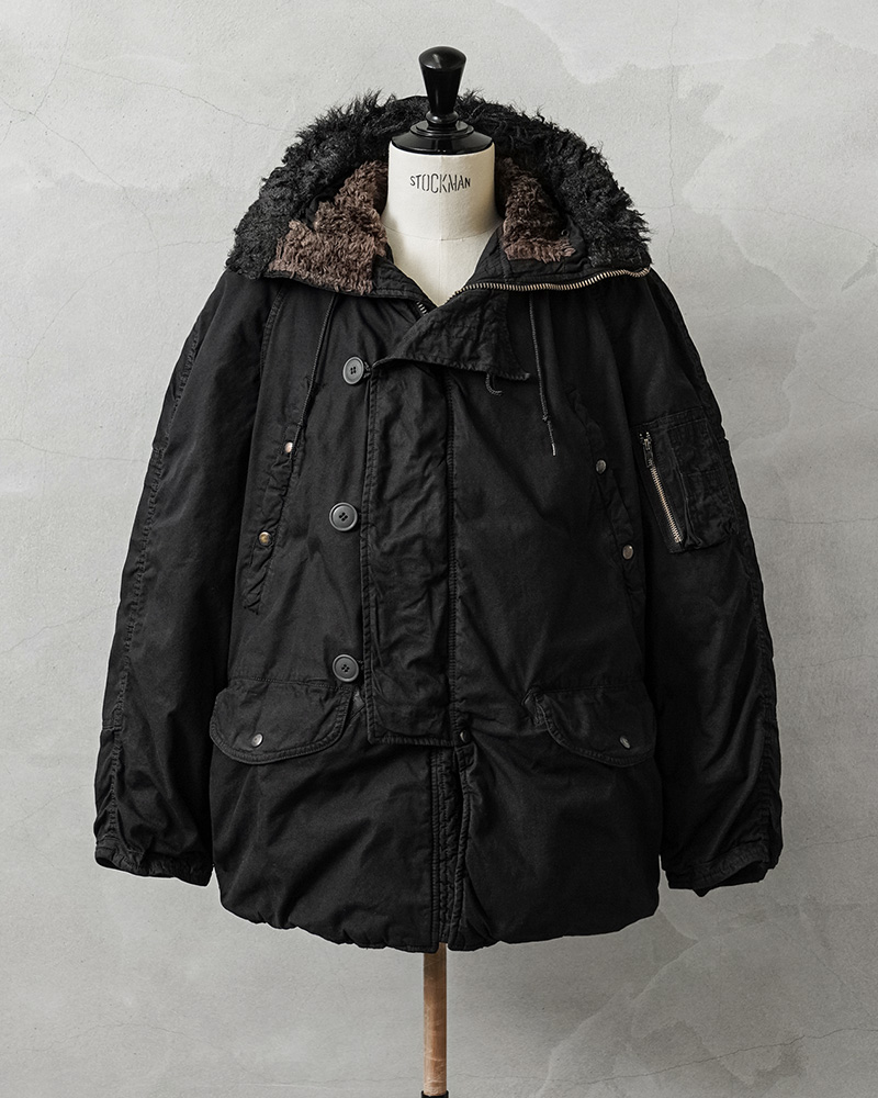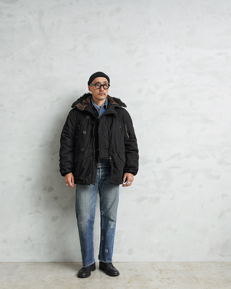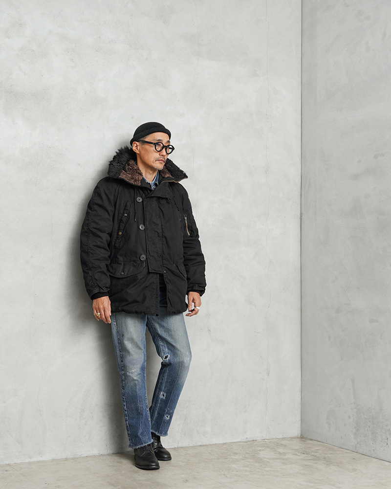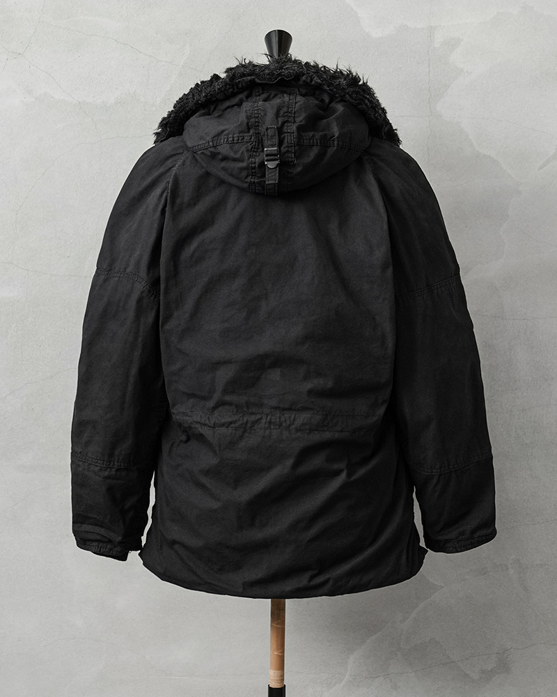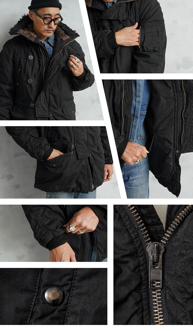 ここ数年、現地買付でもほとんど出なくなり、高騰が激しい希少なデッドストックの米軍N-3Bジャケットを贅沢にDEEP BLACK染めを施しました!ナイロンを含む素材は、真っ黒に染めることが難しい素材ながら、特殊な染色を行うことで、通常の製品染めに比べても深くしっかりと染まったDEEP BLACK仕様となっています。ホワイトのファーもブラックに仕上がり、存在感のあるカラーに染まり上がっています。