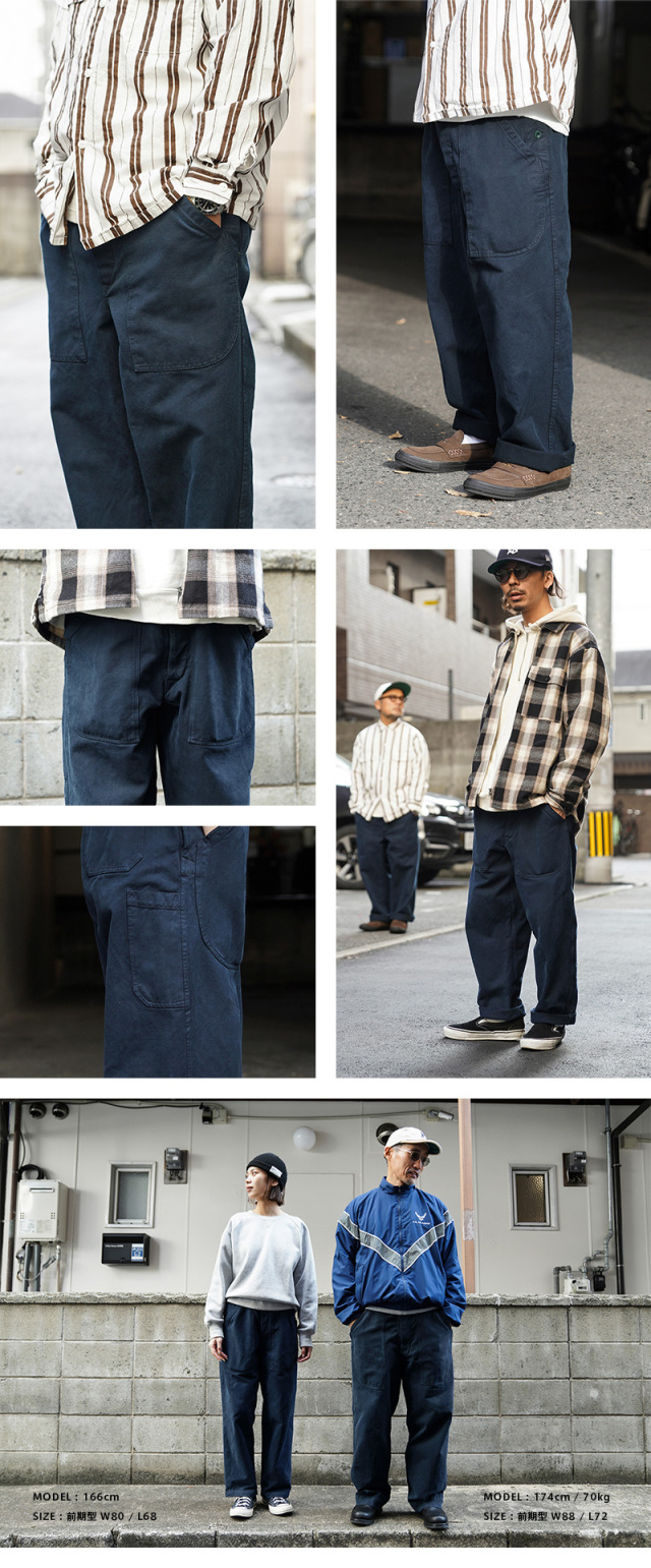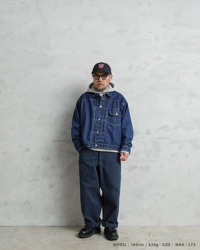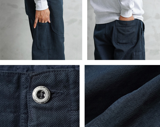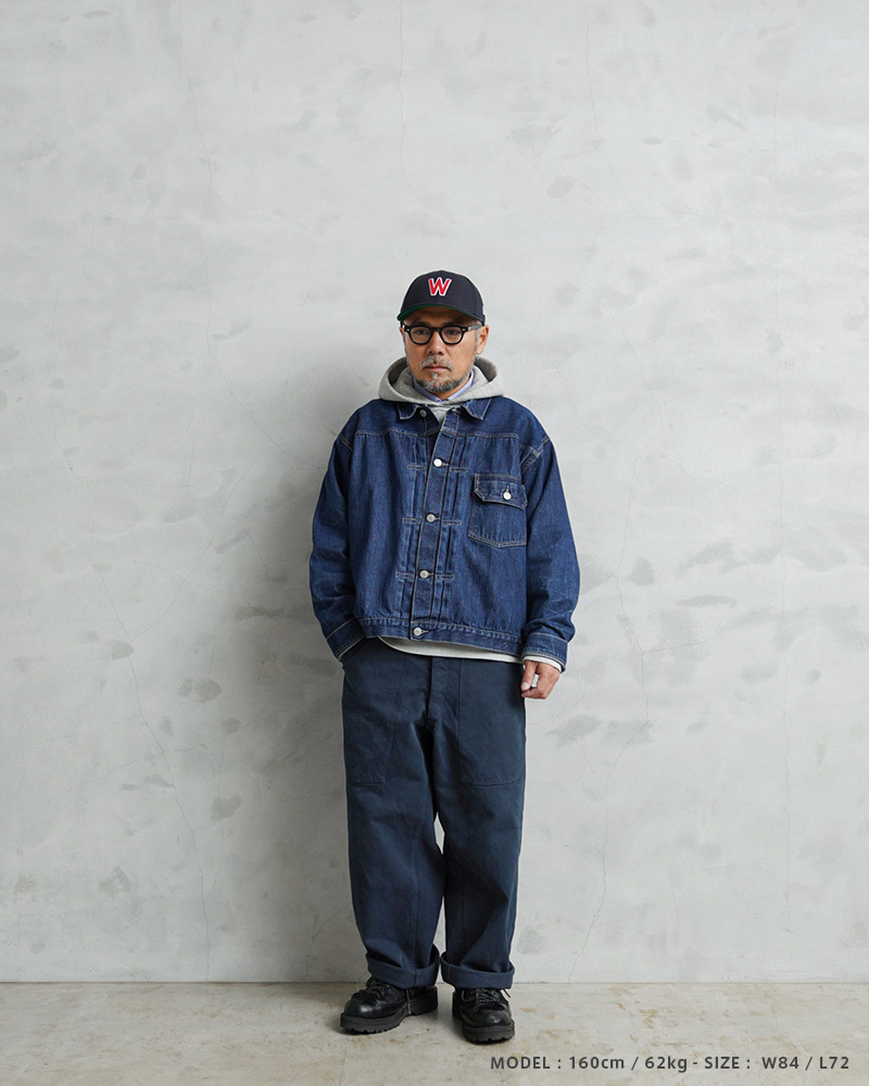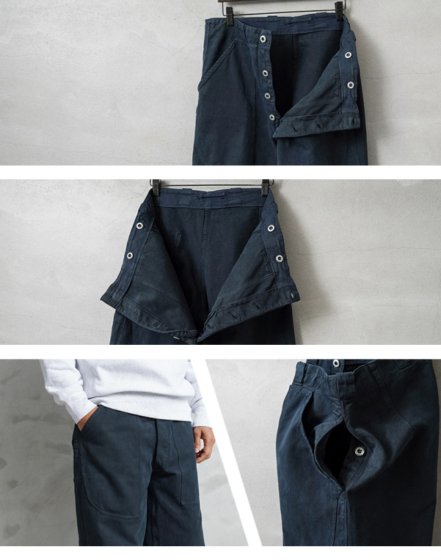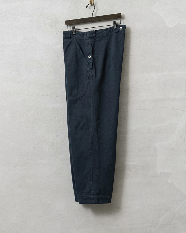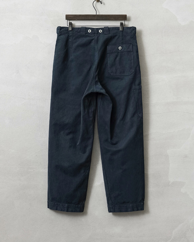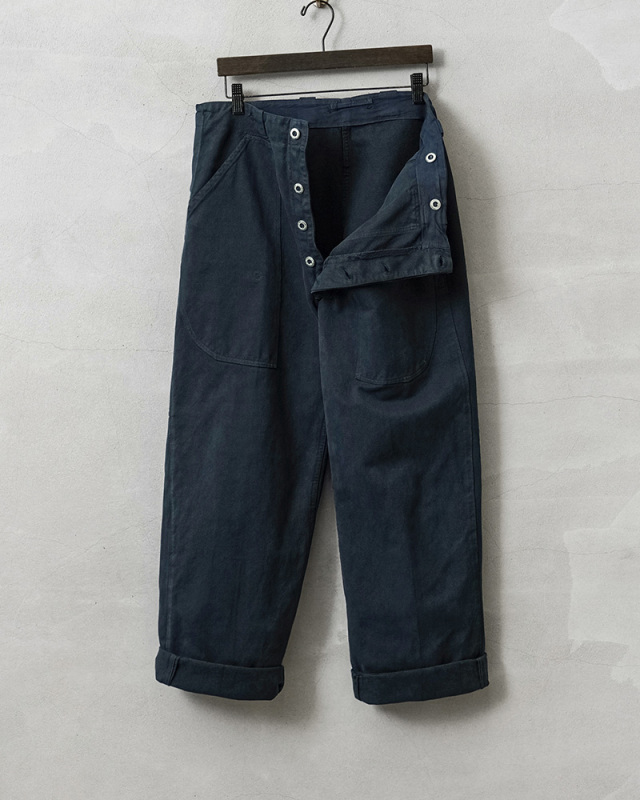 スイス軍のデニム素材のユニフォームは30年代ごろから存在が確認されており、こちらのタイプは主に1950年代以降から採用されていたものになります。年代によってボタンに違いがあり、こちらはアルミニウム製のボタンが採用された通称前期型となります。今回、この希少性が高いアイテムを国内で丁寧にNAVY染めを施しました。黒に近い締まり感がありつつ、重く見えないNAVY染めは本来のがっしりとした質感に、後染めの効果も加わり、非常に雰囲気のある仕上がりに。これからまた履き込むほどにアタリや色落ちが出て、経年変化が非常に楽しみなアイテムです。セットアップでユニフォームとして着用されるアイテムですが、使い勝手がよく堅牢なヘビーオンスのデニムは、脇にスケールポケットが備わっていることもあり、作業服や囚人服としても着用されていたと言われています。ゆったりとした太もも周りから裾にかけてやや細くなるキレイなテーパードシルエットは、様々なコーデにマッチするアイテムです。