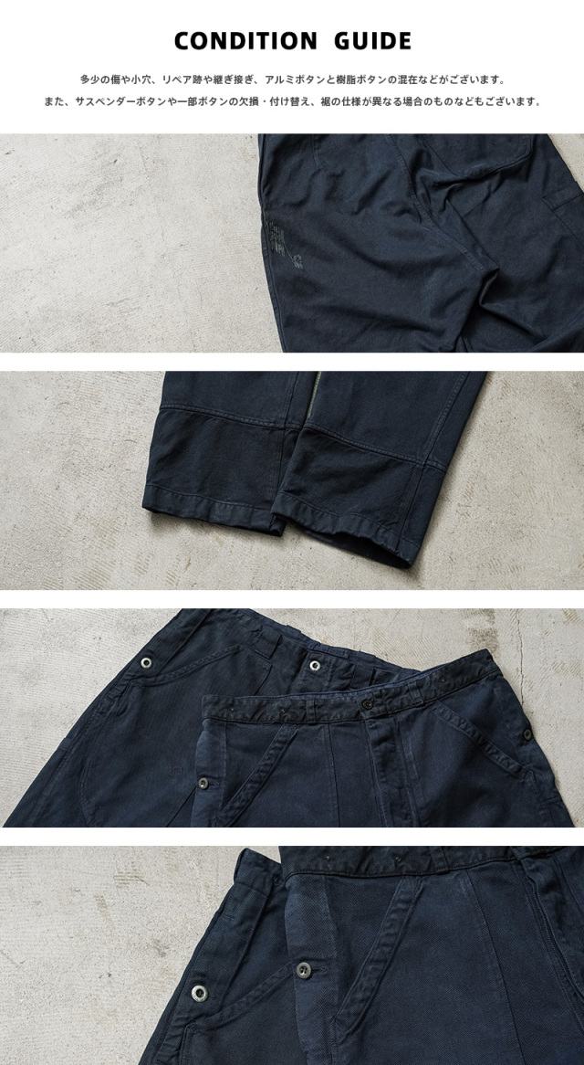 ※こちらの商品はUSED品です。多少の汚れや傷や小穴、リペア跡や継ぎ接ぎ、アルミボタンと樹脂ボタンの混在などがございます。また、仕様やタグが入荷時期による若干の違い、タグの有無、サスペンダーボタンや一部ボタンの欠損・付け替え、裾の仕様が異なる場合のものなどもございます。 商品の状態についてご指定いただくことは出来ませんので予めご了承ください。