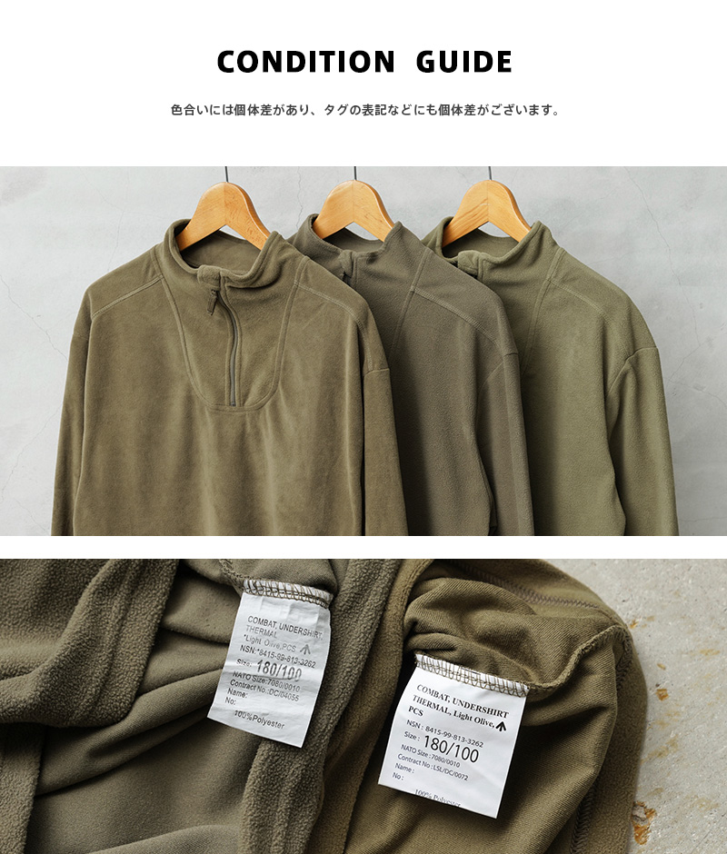 | 商品説明 | WAIPER.inc 実物 イギリス軍 リメイク PCS フリース サーマルシャツ LIGHT OLIVE スクエアテールのご紹介です。 制式名称:COMBAT,UNDERSHIRT THERMAL,Light OLIVE,PCS 寒冷地向けに開発されたイギリス軍のレイヤリングシステム、PCS(Personal Clothing System)のアンダーシャツに属するアイテムです。NORGIE SHIRTS(ノルギーシャツ)の後継にあたります。 前後に大きくラウンドしたロングテールデザインの裾をカットし、スクエアテールにすることでレイヤードや着回しをしやすいアイテムにリメイクを施しました。 速乾性のマイクロフリースを採用したアンダーシャツで、高い保温性と、快適な着心地。首元はハーフジップで、着脱がしやすいようになっています。保温性を高めるスタンドカラーで、寒冷環境下におけるベースレイヤーからミッドレイヤーとして設計された軽量サーマルシャツです。 本来はPCSアノラックの中に着るアイテムなので、様々なアウターの中にレイヤリングすれば真冬の防寒対策に効果を発揮します。袖は少し長めに作られており、袖先に親指を通すサムホールが開いています。 レイヤリングの際、袖が中に巻き込まないように考えらえた仕様ですが、寒いときには手袋代わりとしても活躍してくれます。 非常に素晴らしいミリタリーウェアのさらに使いやすいリメイクです。 |