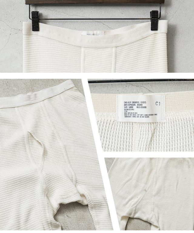 | 商品説明 | 実物 USED 米軍 U.S.A.F. CWU-43 / P フライヤーズ アラミド アンダーパンツ の紹介です。 制式名称:CWU-43 / P DRAWERS, FLYER'S ANTI-EXPOSURE, ARAMID 米空軍のエアクルー用のアラミド(NOMEX)アンダーパンツが登場です。 素材には実際のフライト任務を想定して開発された、難燃のアラミドを使用。サーマルを採用した生地は、肌当たりよく、軽量で保温性も高く、アンダーパンツとして最大限の効果を発揮します。 体の形に沿って立体的に作られた圧迫感のないフロント部分。ウエストはゴムで伸縮し、フィット感はありつつ締めつけ感のない裾の切り替えデザイン。機能的な生地に加え、ストレスのない履き心地を実現する造りになっています。また裾には足裏に掛けるスティラップを備えており、着用時のずり上がりを防ぎ、ブーツインでも安定したフィット感を保ちます。 ウィンタースポーツ、登山など冬場の防寒対策としてや普段着にデイリーに活躍する他、家でのリラックスウェアとしてもオススメのアイテムです。 |