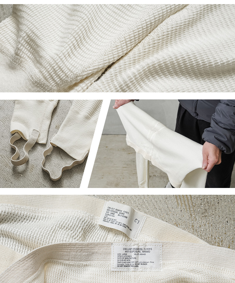 米空軍のエアクルー用のアラミド(NOMEX)アンダーパンツが登場です。素材には実際のフライト任務を想定して開発された、難燃のアラミドを使用。サーマルを採用した生地は、肌当たりよく、軽量で保温性も高く、アンダーパンツとして最大限の効果を発揮します。体の形に沿って立体的に作られた圧迫感のないフロント部分。ウエストはゴムで伸縮し、フィット感はありつつ締めつけ感のない裾の切り替えデザイン。機能的な生地に加え、ストレスのない履き心地を実現する造りになっています。また裾には足裏に掛けるスティラップを備えており、着用時のずり上がりを防ぎ、ブーツインでも安定したフィット感を保ちます。ウィンタースポーツ、登山など冬場の防寒対策としてや普段着にデイリーに活躍する他、家でのリラックスウェアとしてもオススメのアイテムです。