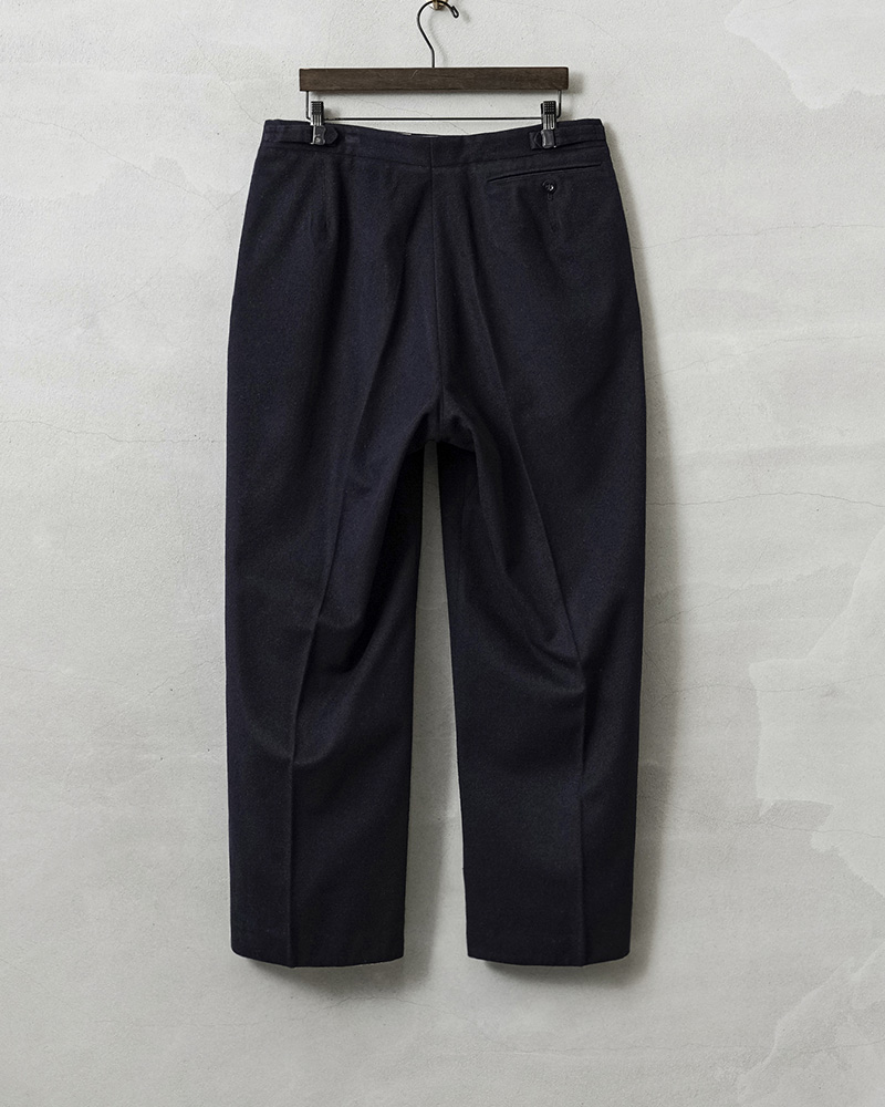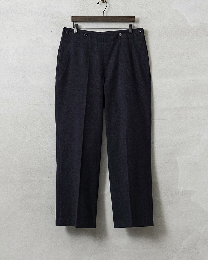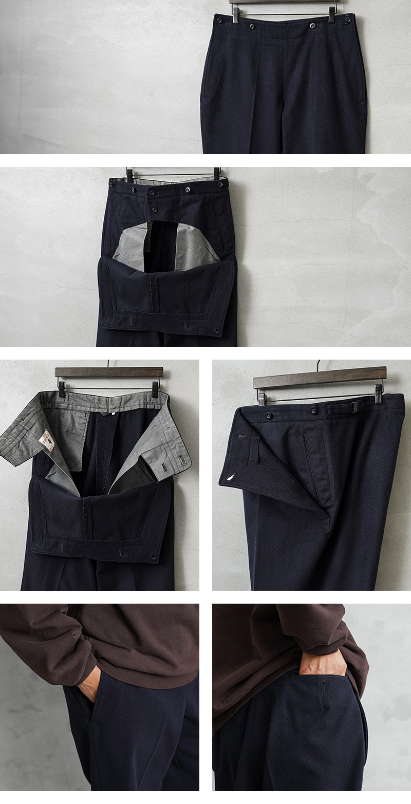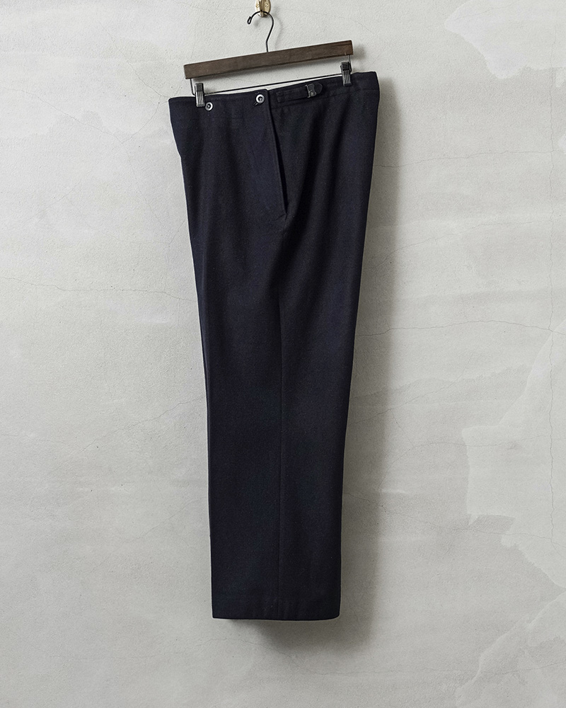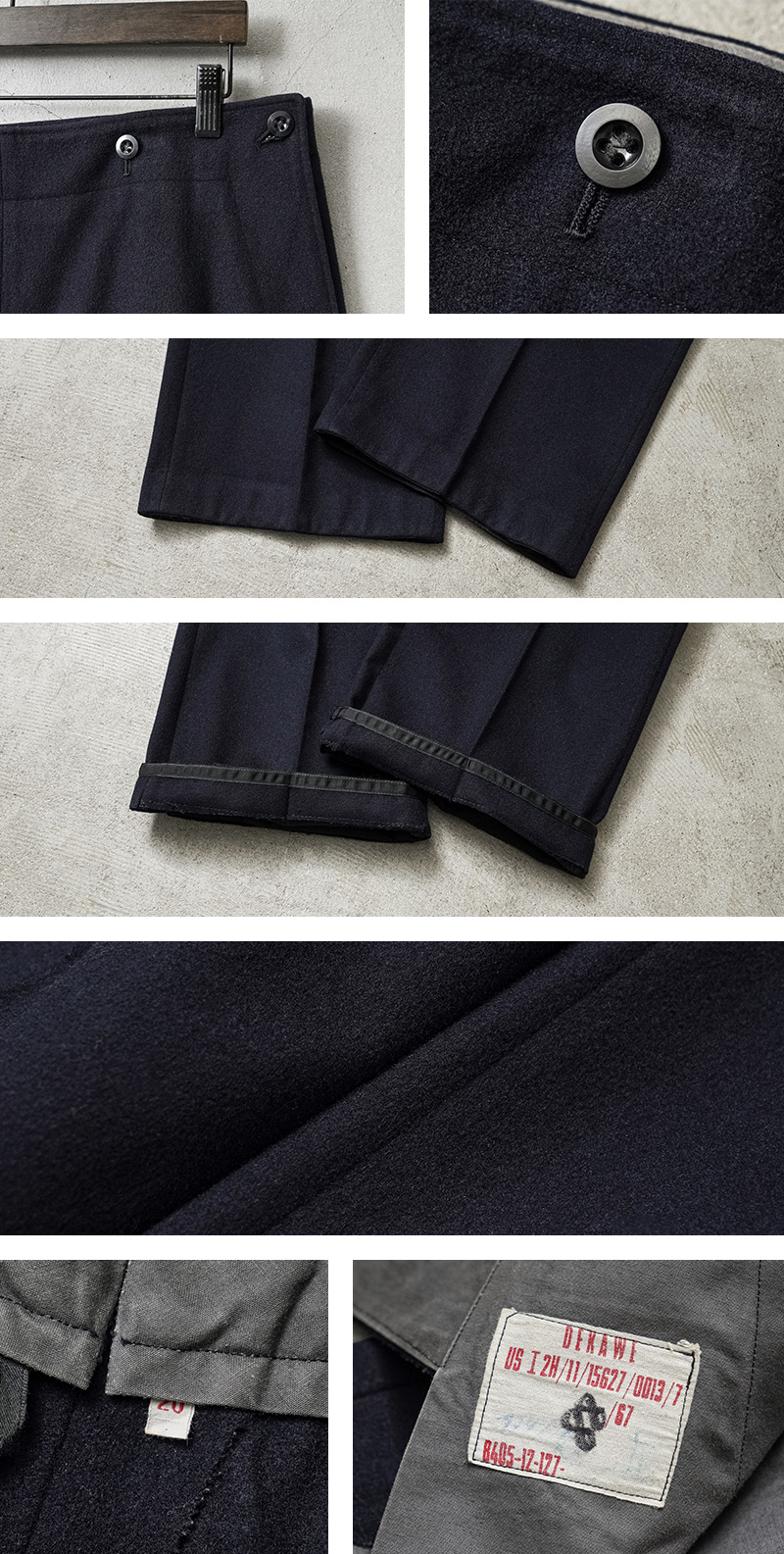 ドイツ海軍で1960年代頃から採用されていた肉厚なウールが使用されたクラシックなトラウザーズで、厚手のメルトンウールは古い年代にのみ見られる素材感で、型崩れしにくく、綺麗なシルエットを長く保ちます。