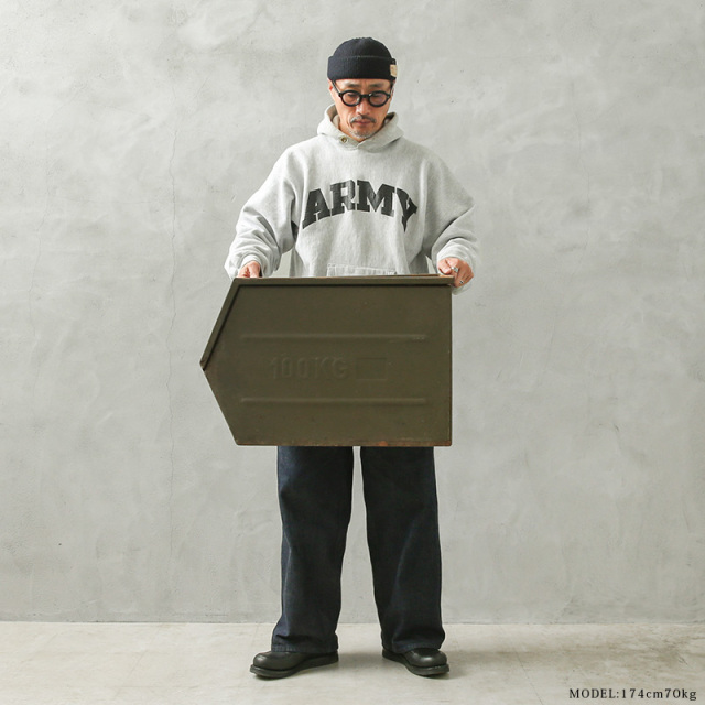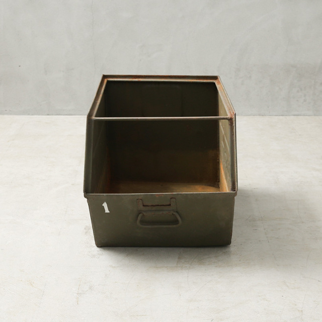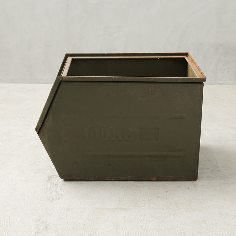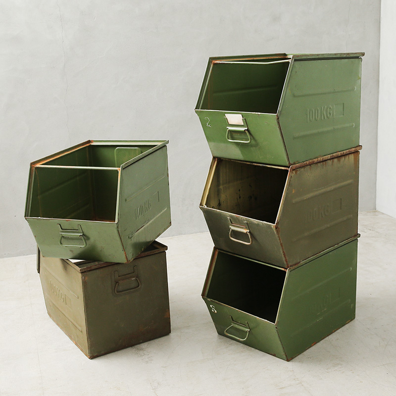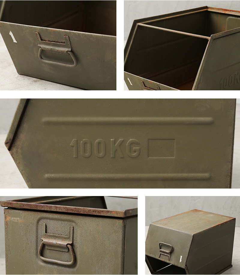 チェコ軍からインダストリアルな雰囲気が漂うビンテージの大型メタル ストッカーボックスの登場です。重厚なスチール製で、複数のボックスを積み重ねて使用できるスタッキング(スタックビン)設計が特徴です。積み重ねた状態でも前面から内容物を取り出せて、雑多に物を入れておいてもほどよく整え感の出るデザイン。無骨な見た目に、耐荷重は100KGと非常に丈夫な造りになっています。収納力も抜群でアウトドアやガレージでの活用はもちろん、インダストリアル・アーミースタイルなお部屋にインテリアの一部として取り入れるだけでより本格的な雰囲気を味わうことが出来ます。