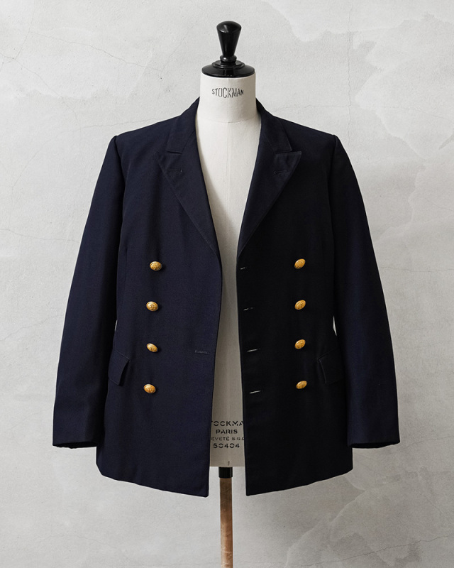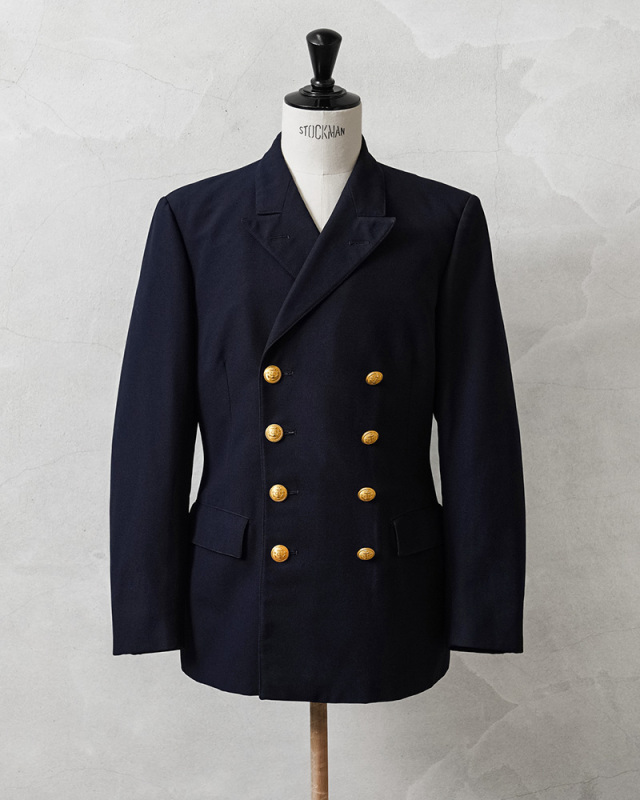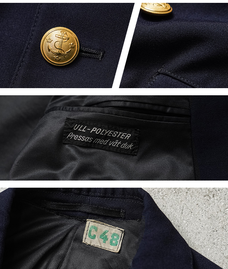 希少なスウェーデン海軍の士官や下士官向けのドレスジャケットが入荷しました。 力強さを感じさせる幅広のピークドラペル(剣襟)が特徴的なダブルブレストのブレザージャケット。 フロントに2箇所のフラップポケット、両側に内ポケットも備えています。 ウールの持つ保温性・上品さと、耐久性・イージーケア性を併せ持つ機能的なウール混ポリエステル素材で、内側には滑りの良いメッシュ素材の裏地が袖先まで付属しています。 深みのあるダークネイビーに、スウェーデン王国の国章である三つの王冠(トリプルクラウン)と海軍を象徴する錨マークが刻印されたゴールドボタンが高級感と特別感を感じさせます。 細部の作り込みや体に添う美しいシルエットは、流行り廃りのない完成された永遠の定番デザイン。近年人気で手に入りにくくなってきたスウェーデン物の上質さも感じさせる、滅多に放出されることの無い大変希少な1枚です。 |