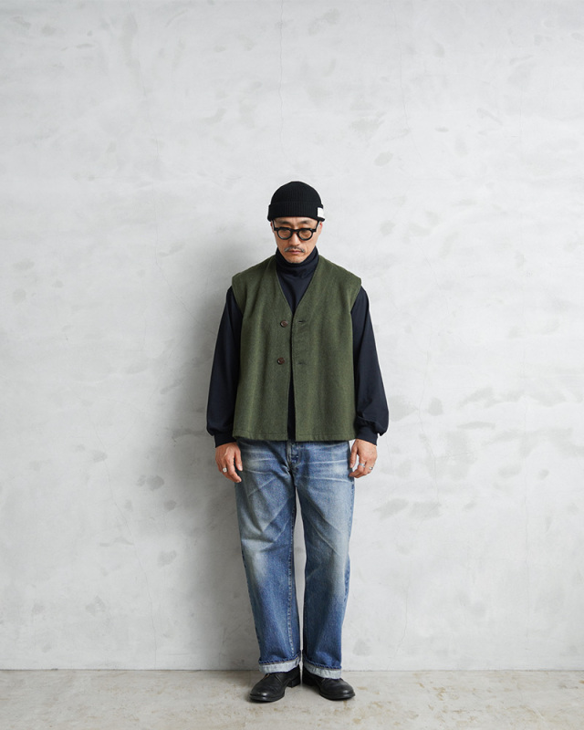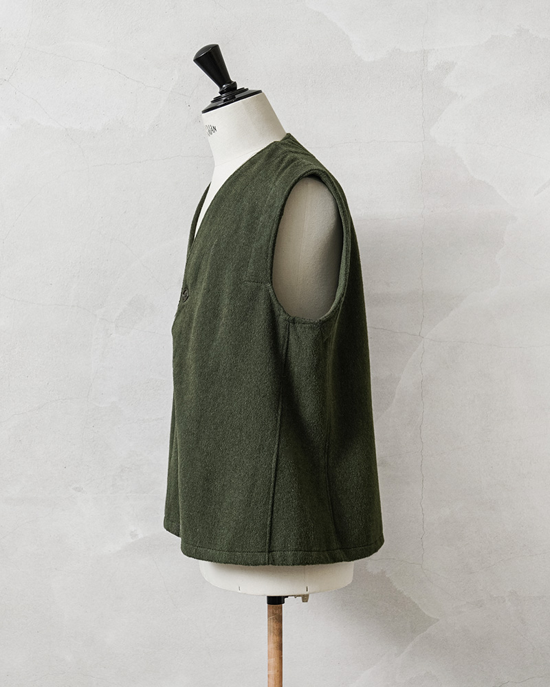 フランス軍のウールの風合いと趣のある色合いが魅力的なライナーベスト。 年代は詳しくはわかりませんが、防寒用のライナーとして官給されていたベストで、しっかりと目の詰まったウールメルトン生地。フロントは二つボタンで、なんともいえない独特な柄が入っています。 ウールの持つ保温性はもちろん、フランス軍らしい素朴でありながらどこかスタイリッシュで洗練された雰囲気の漂う一枚。 シンプルなデザインとオリーブカラーが汎用性が高く男女問わず幅広く着用可能です。 |
