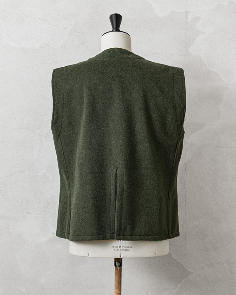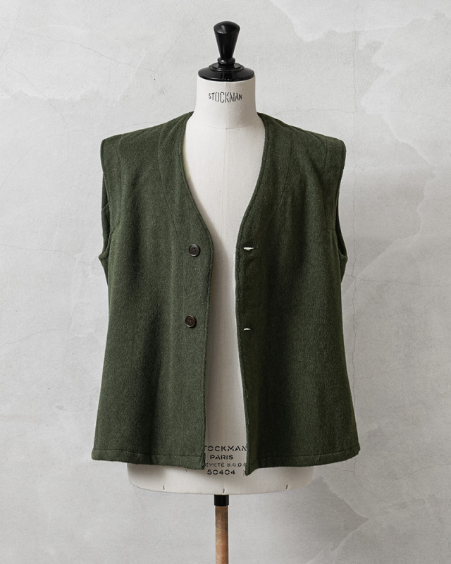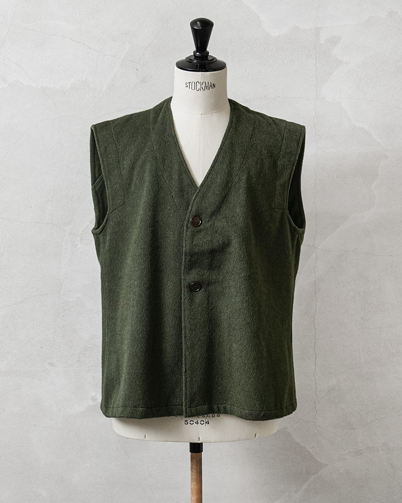 フランス軍のウールの風合いと趣のある色合いが魅力的なライナーベスト。年代は詳しくはわかりませんが、防寒用のライナーとして官給されていたベストで、しっかりと目の詰まったウールメルトン生地。フロントは二つボタンで、なんともいえない独特な柄が入っています。ウールの持つ保温性はもちろん、フランス軍らしい素朴でありながらどこかスタイリッシュで洗練された雰囲気の漂う一枚。 シンプルなデザインとオリーブカラーが汎用性が高く男女問わず幅広く着用可能です。