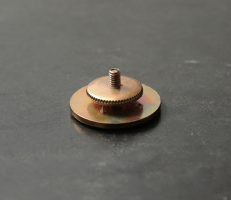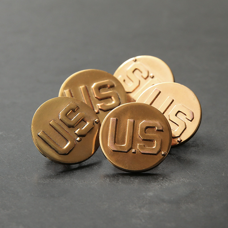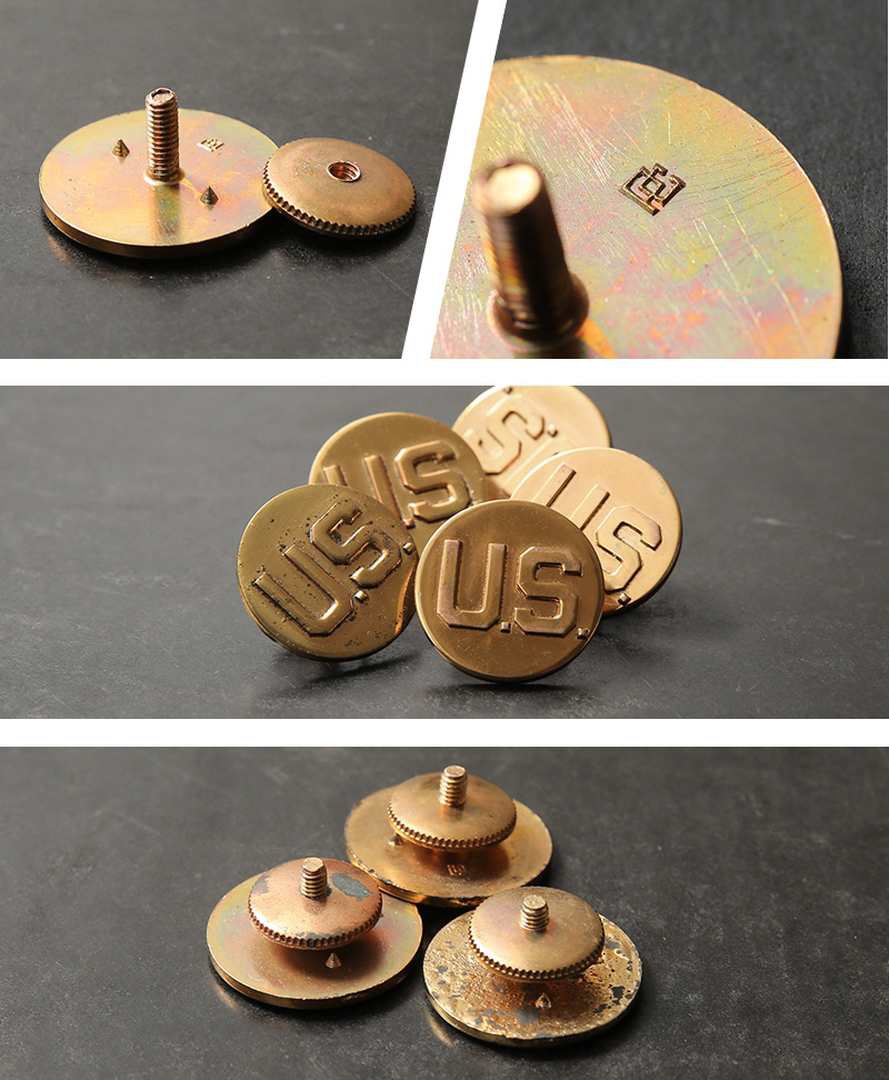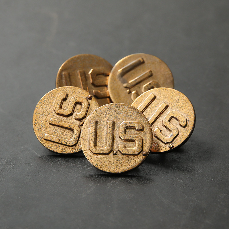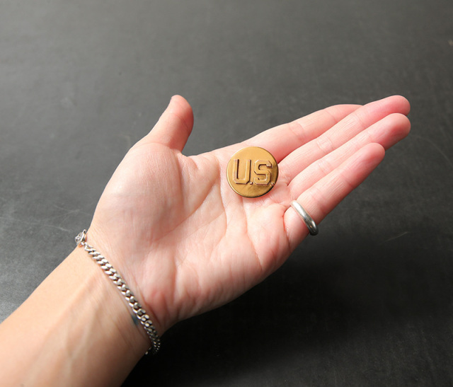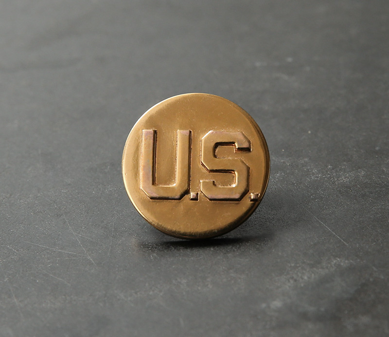 1930年代~1940年代、第二次世界大戦期の米軍陸軍下士官兵用襟章バッジが登場しました。当時の陸軍兵士の右襟に着用され、所属を示す襟章(カラーディスク)。 丈夫な真鍮製で、ブロンズのような赤味がかったゴールドカラーに仕上げられています。背面はネジ式ポストと留め具(サムスクリューナット)を使用して固定するタイプ。これは初期のモデルの特徴で、1942年以降は、クラッチバック式(蝶タック)が標準となっています。『U.S.』のロゴが印象的で、趣のあるゴールドカラーと質感がヴィンテージの雰囲気抜群。コレクターアイテムとしてはもちろん、ジャケットやコートの襟、ベルトホール、帽子などに付けてブローチ感覚で使用するなど、使い方次第で魅力が広がるアイテム。