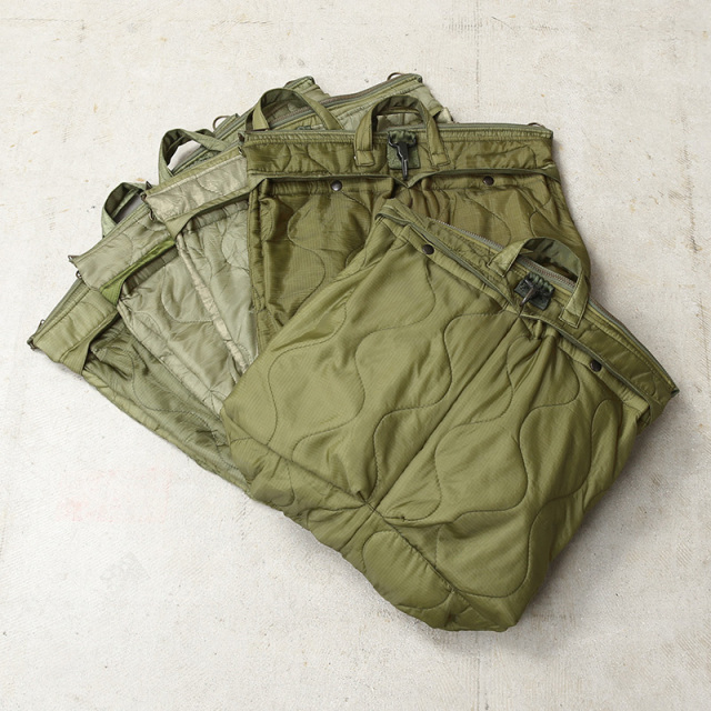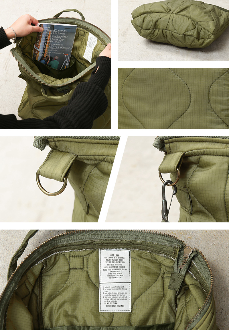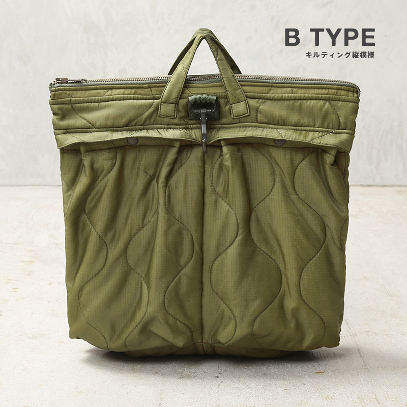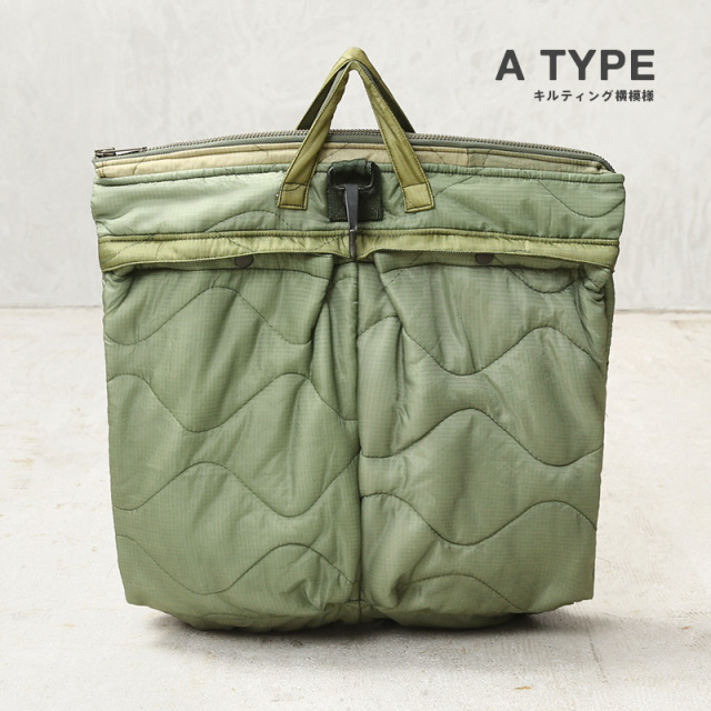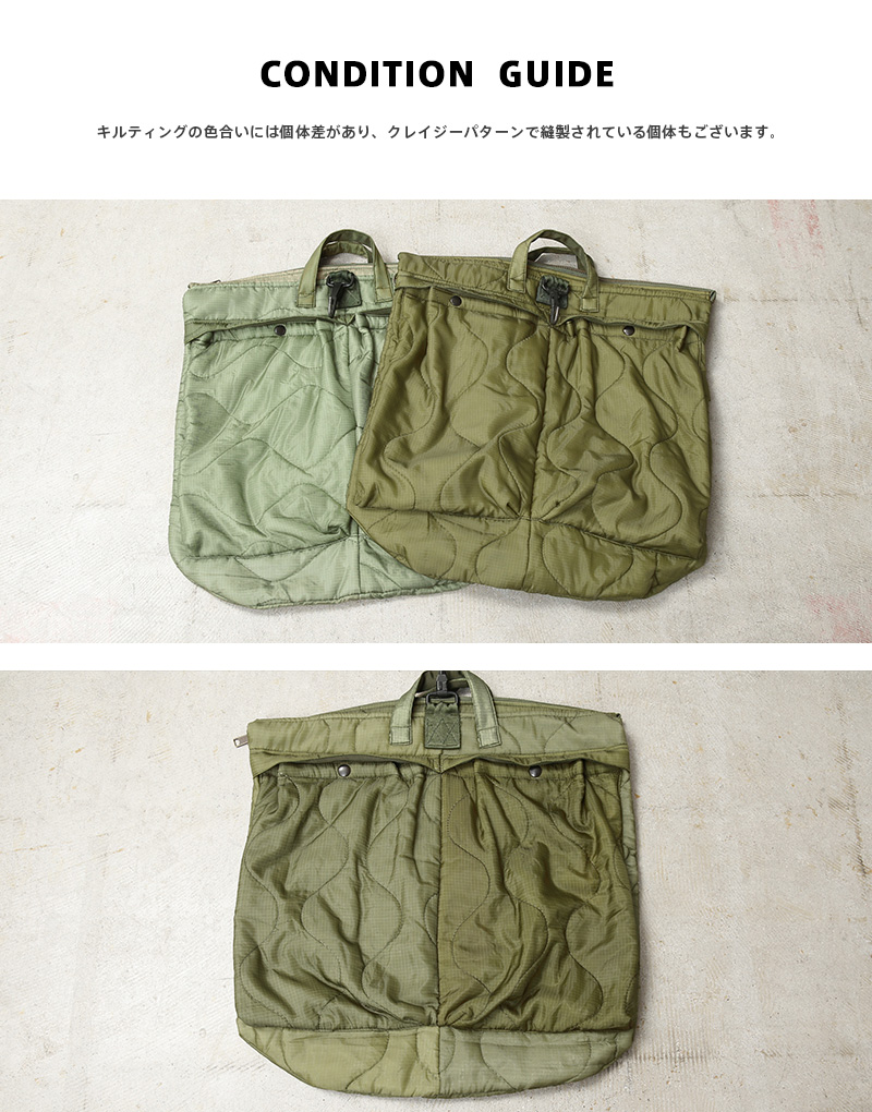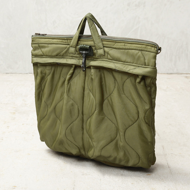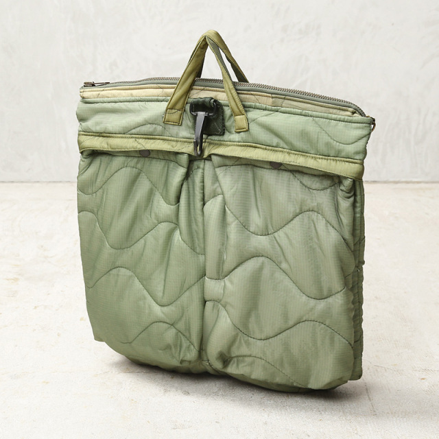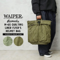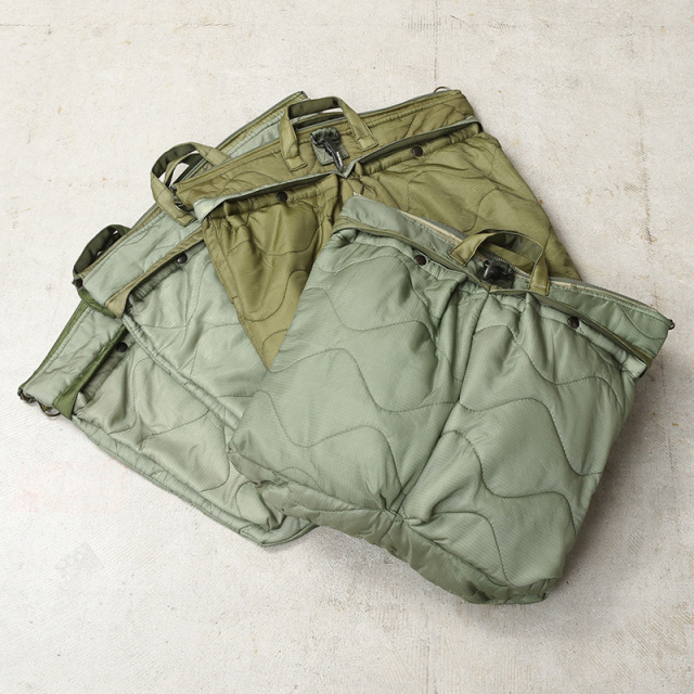 WAIPER.incで米軍の名作フライヤーズ ヘルメットバッグを制作しました!素材には「実物 米軍 M-65 フィールドカーゴパンツ」の内側に装着される防寒用の「実物 新品 デッドストック 米軍 M-65 フィールドパンツ キルティング ライナー」のデッドストックを使用しています!このフィールドパンツ用キルティングライナーも放出が年々減少し、WAIPER.incでリプロダクトするほどになったアイテムですが、こちらのヘルメットバッグには実物品を贅沢に使用しています!4thモデルの初期型から見られるフロントの金属フックには、「実物 米軍 ダブルストラップ コーデュラナイロン ダッフルバッグ」の上部に実際使用されていた、スナップフックを使用しています!フック部分はUSEDですが、それが逆に雰囲気良い印象に。実物ヘルメットバッグよりもひと回り大きいフックが目を引くポイントです!