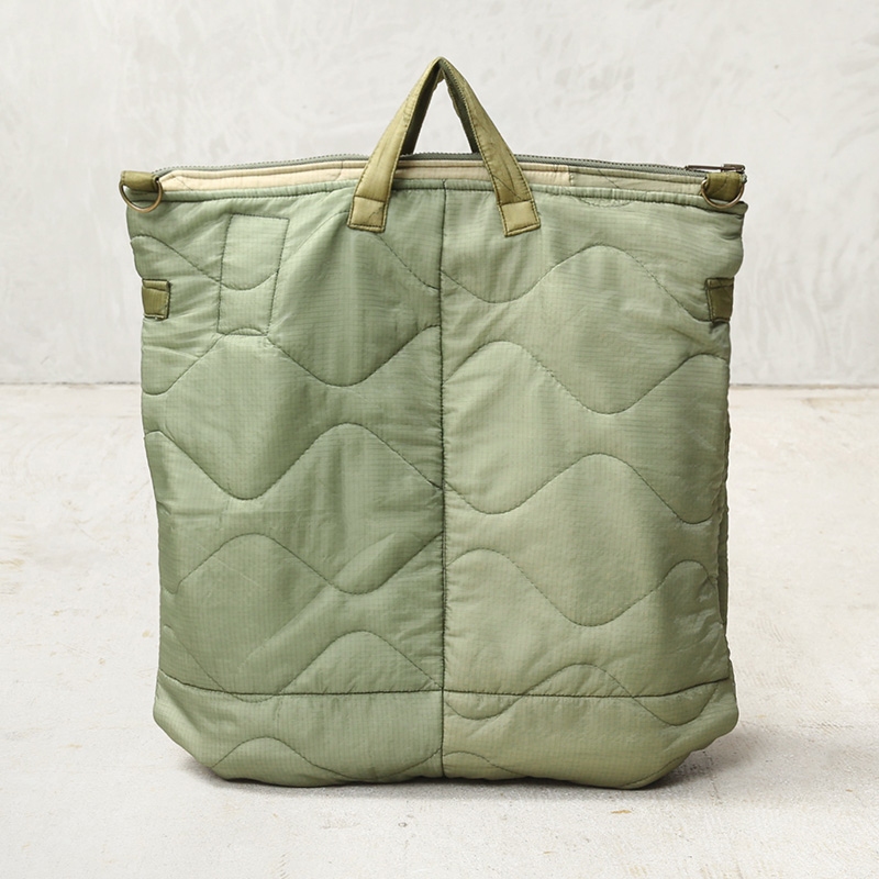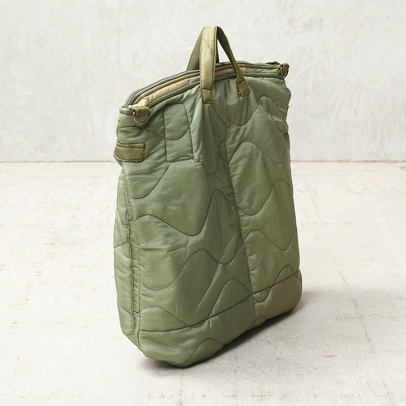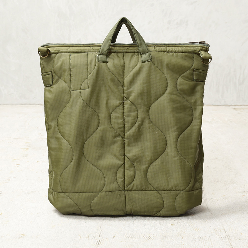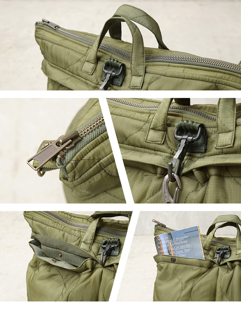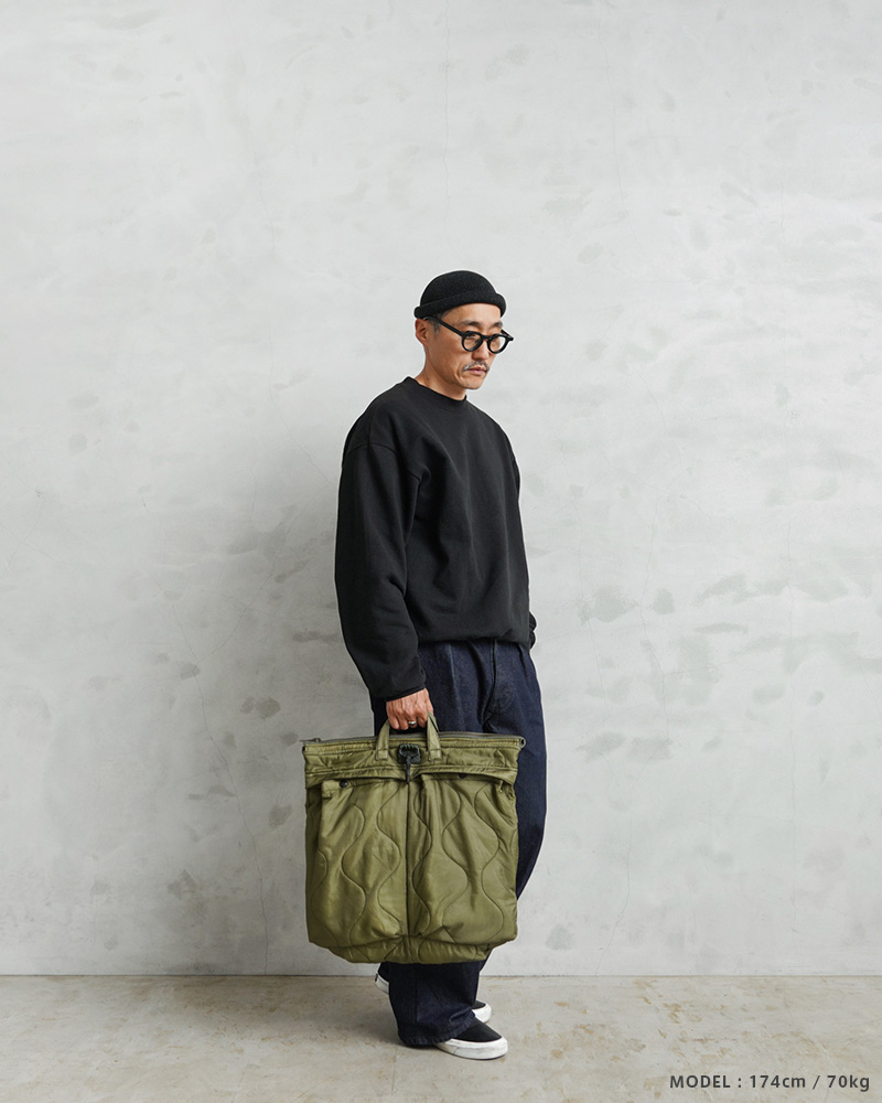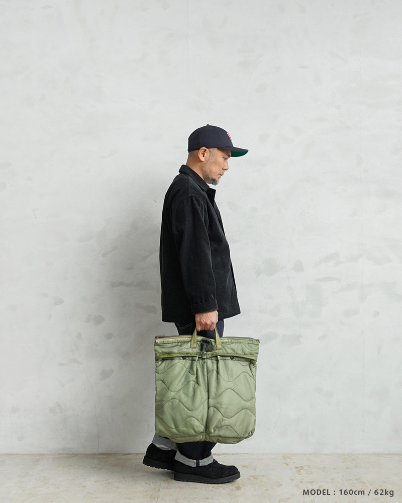 WAIPER.incで米軍の名作フライヤーズ ヘルメットバッグを制作しました!素材には「実物 米軍 M-65 フィールドカーゴパンツ」の内側に装着される防寒用の「実物 新品 デッドストック 米軍 M-65 フィールドパンツ キルティング ライナー」のデッドストックを使用しています!このフィールドパンツ用キルティングライナーも放出が年々減少し、WAIPER.incでリプロダクトするほどになったアイテムですが、こちらのヘルメットバッグには実物品を贅沢に使用しています!4thモデルの初期型から見られるフロントの金属フックには、「実物 米軍 ダブルストラップ コーデュラナイロン ダッフルバッグ」の上部に実際使用されていた、スナップフックを使用しています!フック部分はUSEDですが、それが逆に雰囲気良い印象に。実物ヘルメットバッグよりもひと回り大きいフックが目を引くポイントです!