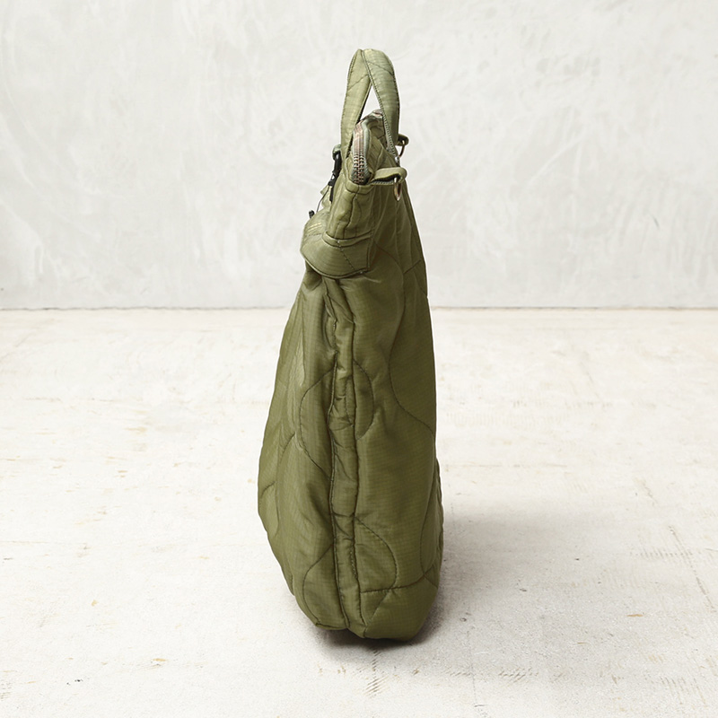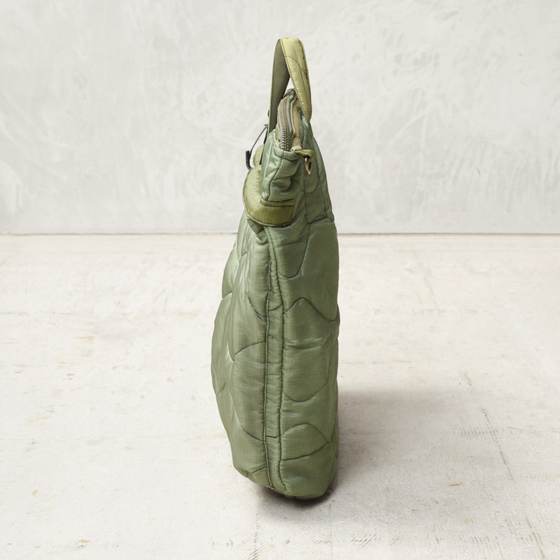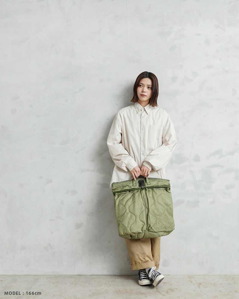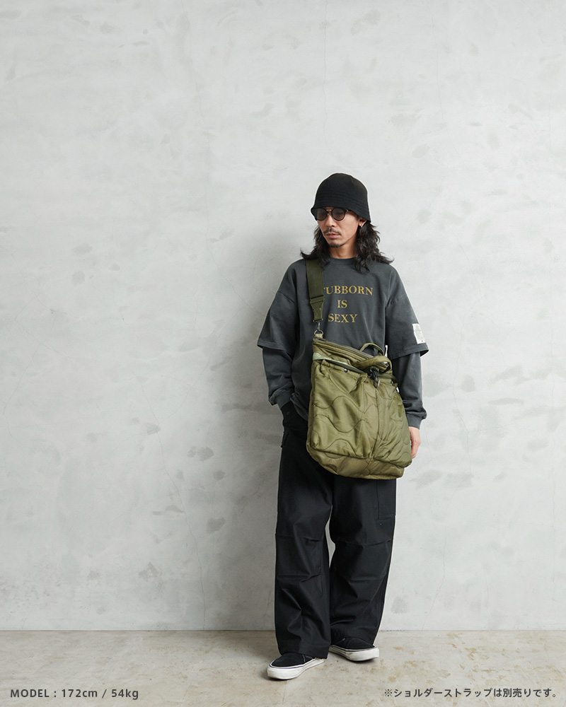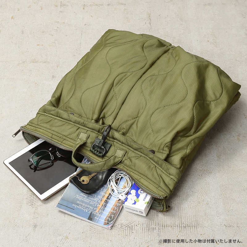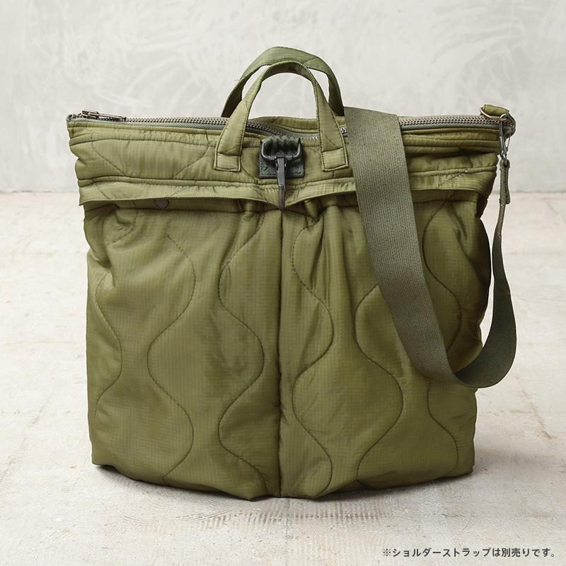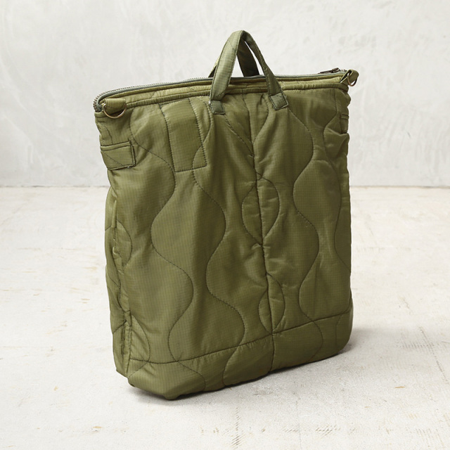WAIPER.incで米軍の名作フライヤーズ ヘルメットバッグを制作しました!素材には「実物 米軍 M-65 フィールドカーゴパンツ」の内側に装着される防寒用の「実物 新品 デッドストック 米軍 M-65 フィールドパンツ キルティング ライナー」のデッドストックを使用しています!このフィールドパンツ用キルティングライナーも放出が年々減少し、WAIPER.incでリプロダクトするほどになったアイテムですが、こちらのヘルメットバッグには実物品を贅沢に使用しています!4thモデルの初期型から見られるフロントの金属フックには、「実物 米軍 ダブルストラップ コーデュラナイロン ダッフルバッグ」の上部に実際使用されていた、スナップフックを使用しています!フック部分はUSEDですが、それが逆に雰囲気良い印象に。実物ヘルメットバッグよりもひと回り大きいフックが目を引くポイントです!