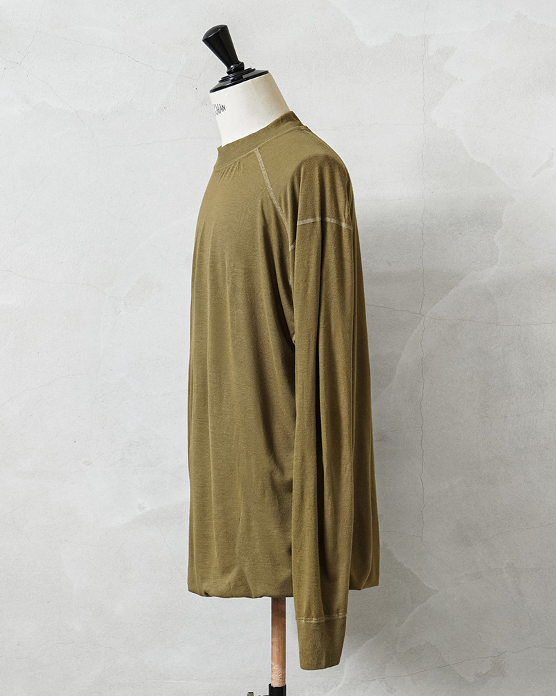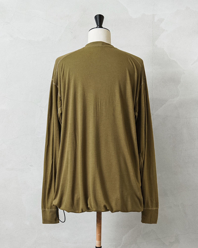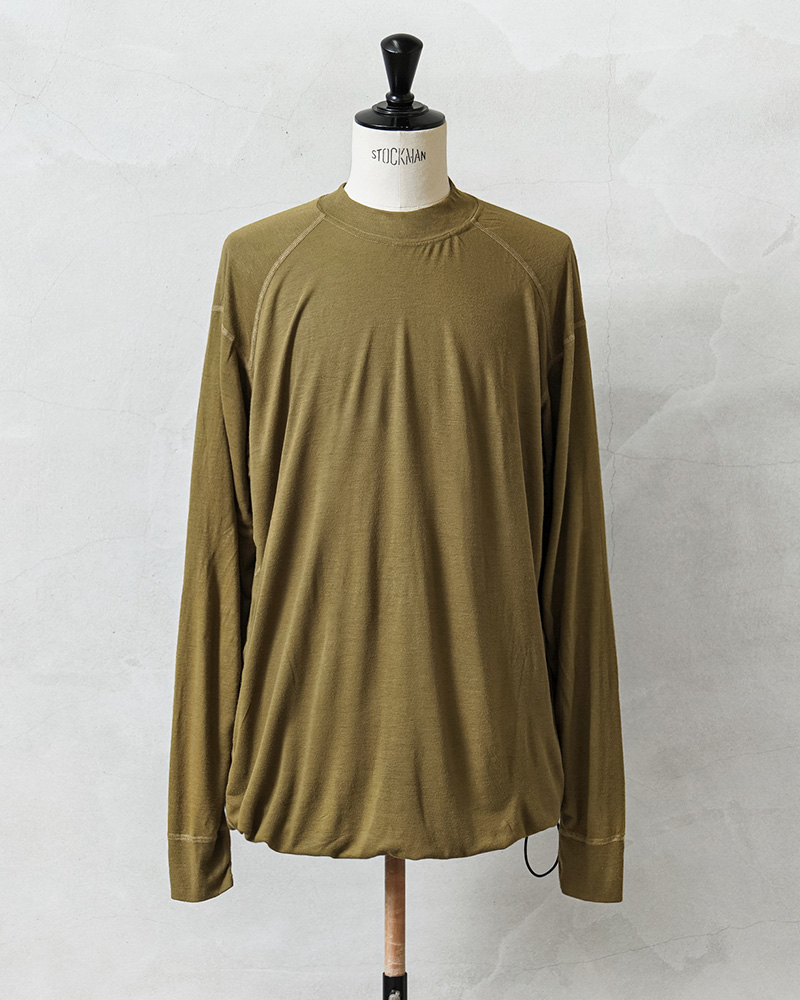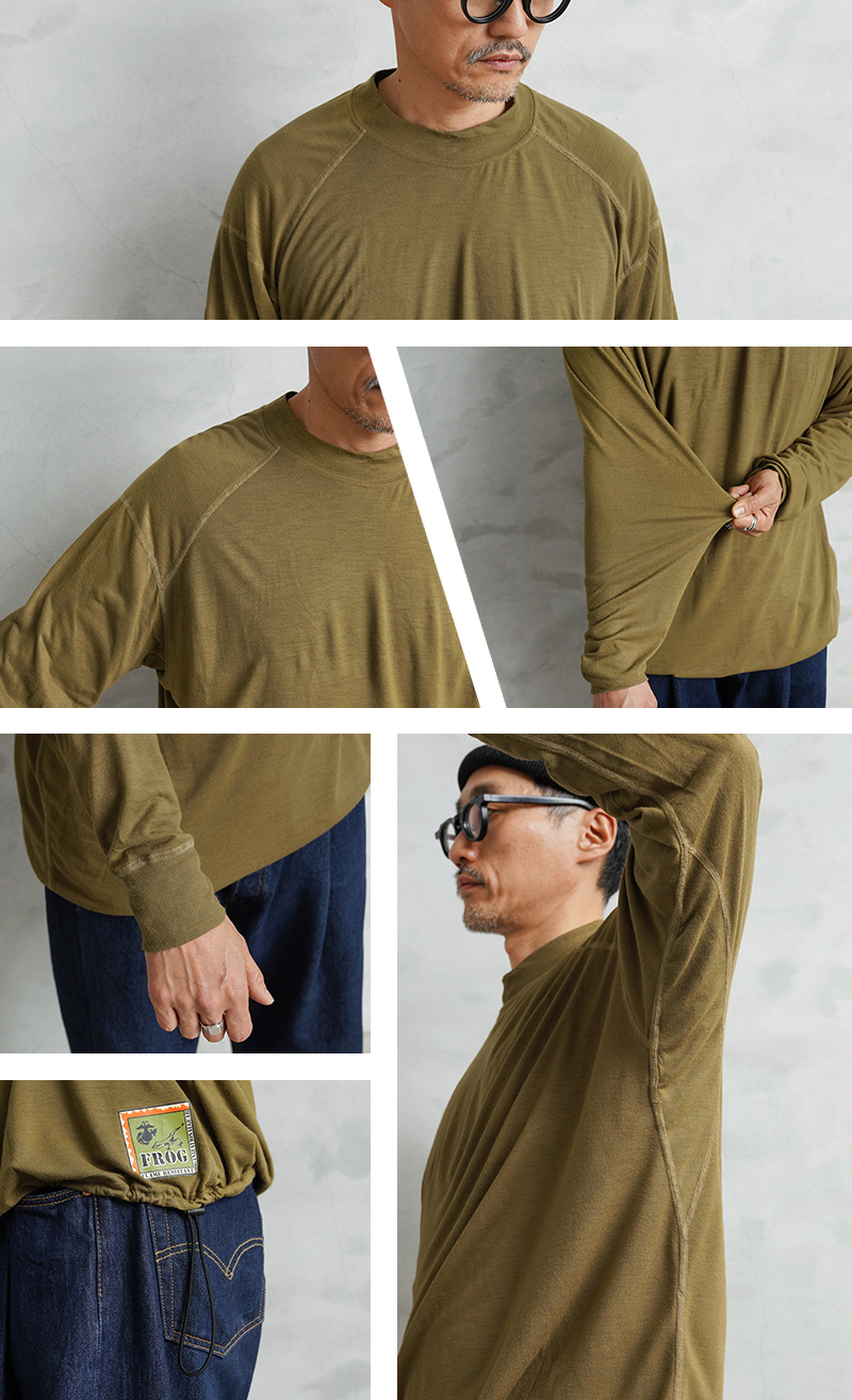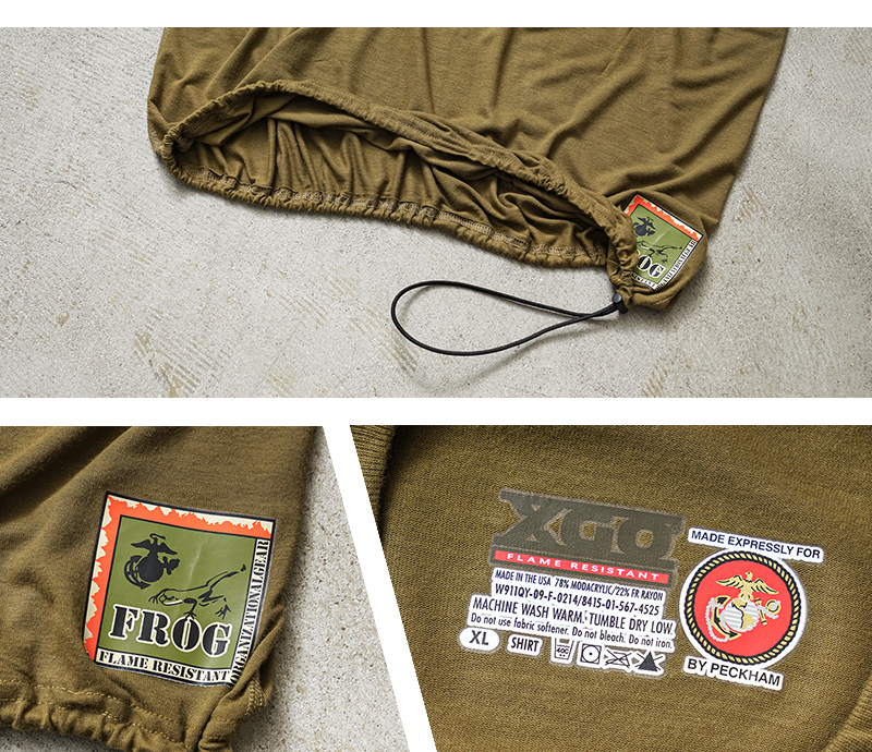 米軍のカットソーアイテムを多く手掛ける、PECKHAM社製のモックネック(XLサイズ)のロングスリーブシャツの裾部分にドローコードを追加したリメイクをWAIPER.incで制作しました!アメリカ軍海兵隊(US MARINE CORPS)で着用されていたベースレイヤーで、薄手のしっとりとした生地はで吸汗性、透湿性、抗菌性、速乾性に優れた心地よい着心地。裾にラバープリントされている「FROG」の文字と、マリンコープスのロゴに蛙のモチーフのデザインは「FLAME RESISTANT ORGANIZATIONAL GEAR」の略称で文字通り、難燃性の素材を使用したアイテム群で構成されたUSMCのプロダクトを指します。少し幅広めのモックネック部分にはリブ襟を採用することによってフィット感を高めています。
