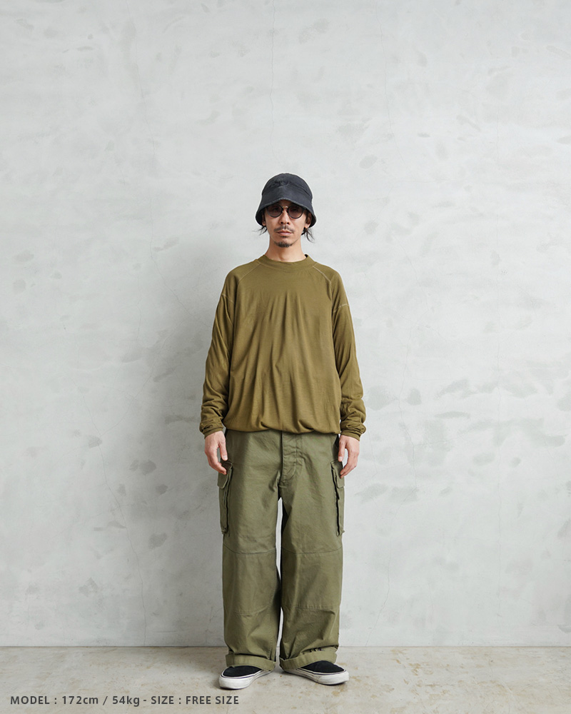 | 商品説明 | WAIPER.inc 実物 新品 デッドストック 米軍 リメイク USMC FROG モックネック L/S Tシャツ COYOTE 裾ドローコードのご紹介です。 米軍のカットソーアイテムを多く手掛ける、PECKHAM社製のモックネック(XLサイズ)のロングスリーブシャツの裾部分にドローコードを追加したリメイクをWAIPER.incで制作しました! アメリカ軍海兵隊(US MARINE CORPS)で着用されていたベースレイヤーで、薄手のしっとりとした生地はで吸汗性、透湿性、抗菌性、速乾性に優れた心地よい着心地。裾にラバープリントされている「FROG」の文字と、マリンコープスのロゴに蛙のモチーフのデザインは「FLAME RESISTANT ORGANIZATIONAL GEAR」の略称で文字通り、難燃性の素材を使用したアイテム群で構成されたUSMCのプロダクトを指します。 少し幅広めのモックネック部分にはリブ襟を採用することによってフィット感を高めています。肩部分は切り替えになっており、肩線からオフセットさせることによってレイヤードした際のゴロつきを解消するのが狙いだと考えられます。さらに、脇下のガゼット(マチ)など立体的に可動域を意識したパターンになっています。 高性能生地、優れた機能性、1枚でもレイヤードでも着こなしが楽しめるシンプルなデザインは、タウンユースからアウトドアシーンまで幅広い場面で活躍すること間違いなしのアイテムです。 |