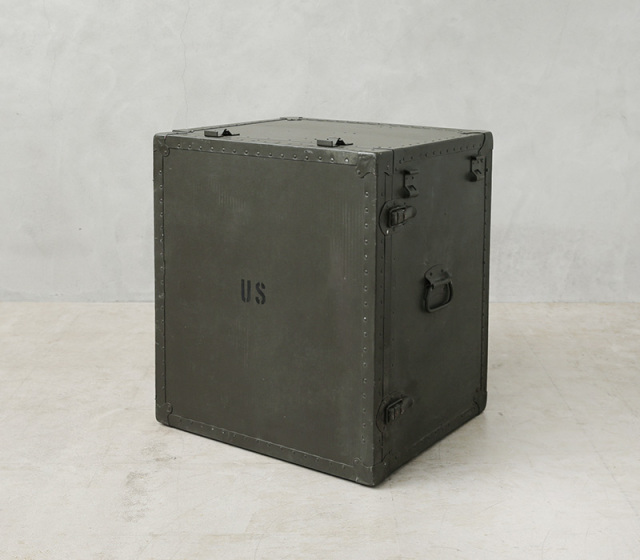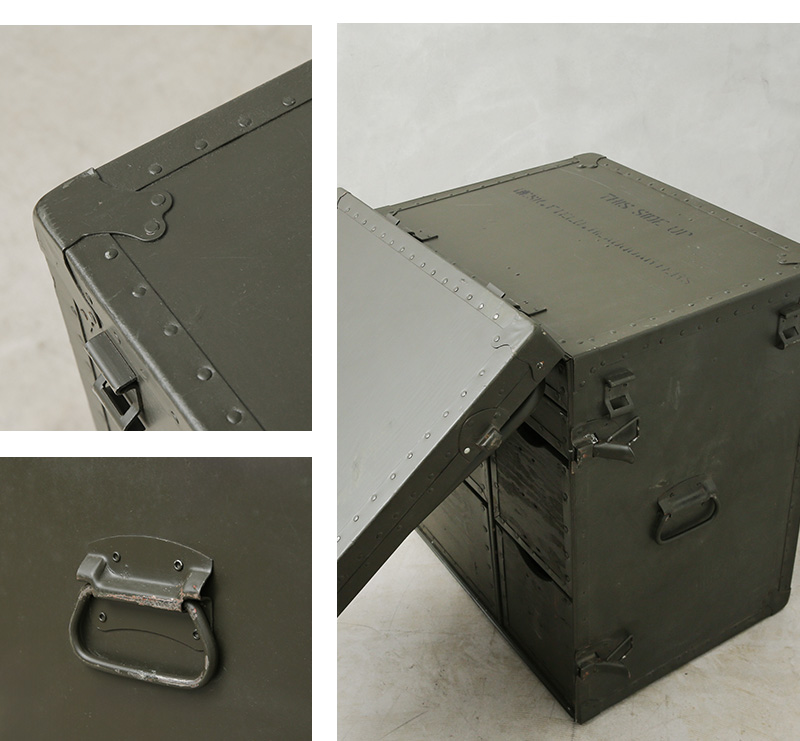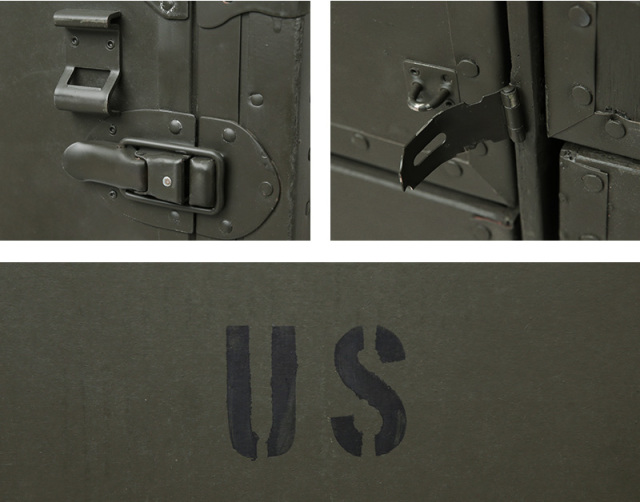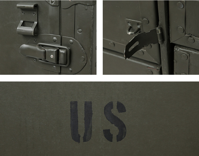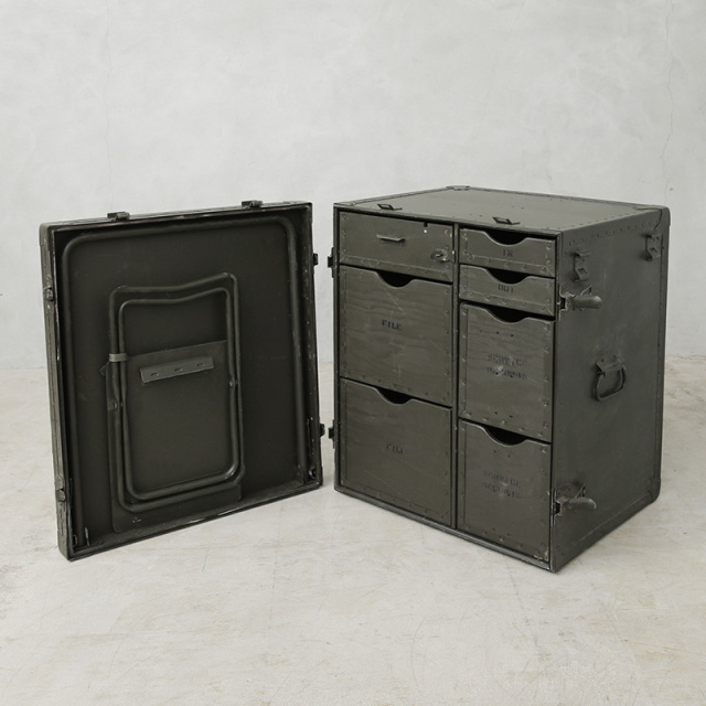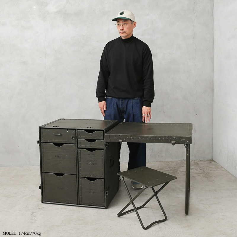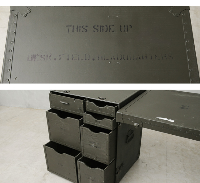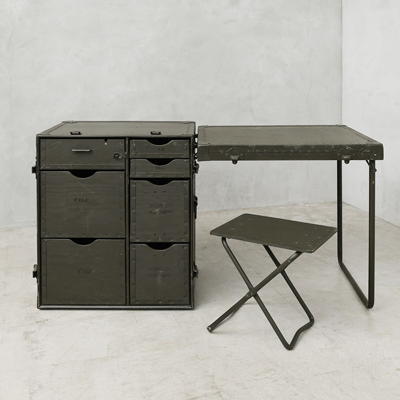 今ではUSEDでも放出されることは極めて少なく、市場になかなか出回らない希少価値の高い名品です。通称カンパニーデスクとも呼ばれ、主に中隊規模以上の司令部に配備されていたこちらのアイテムは、ポリエチレン製フィールドデスクが登場する90年代まで使用されていました。DESK,FIELD,HEADQUARTERSやUSといった様々なステンシルが施されており、引き出しにも多くの箇所にそれぞれの使用用途のステンシルがされています。ファイルフォルダーなどの7つの引き出しに加え、折りたたみ式スツールが1脚付属しています。