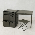 | 素材 | ウッド(天板、ソデ、引き出し、スツール) ファイバー(ウッドパネルの接続部) スチール(クリップ部、ビス、天板をセットするフック、キャリングハンドル等) |