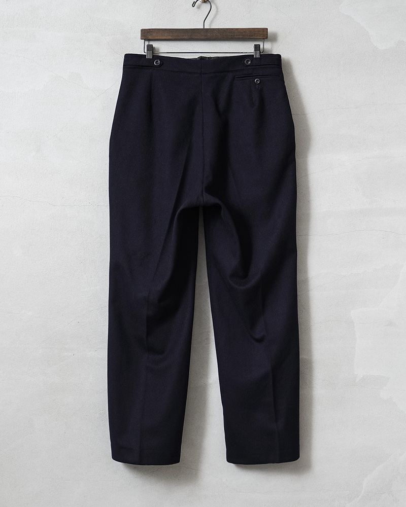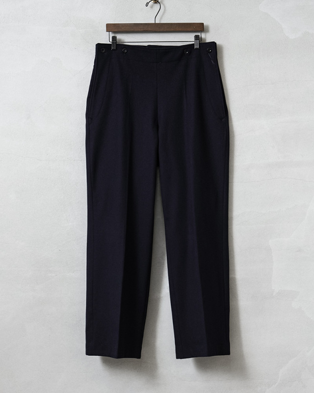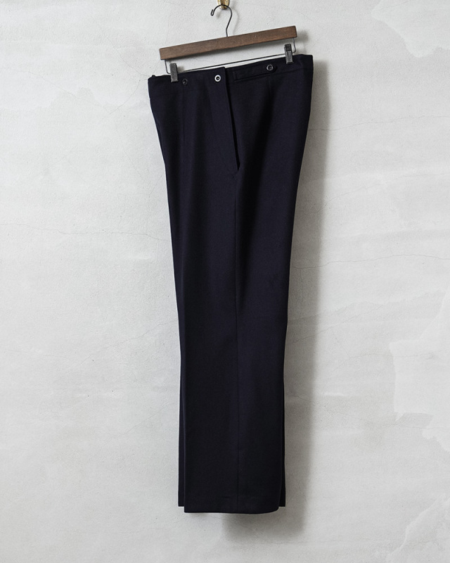ドイツ軍よりヴィンテージの雰囲気漂うセーラーパンツが入荷しました!ドイツ海軍で1960年代頃から採用されていた肉厚なウールが使用されたクラシックなトラウザーズで、厚手のメルトンウールは古い年代にのみ見られる素材感で、型崩れしにくく、綺麗なシルエットを長く保ちます。フロント部分はセーラーパンツ特有のフラップ留めデザインで、サイドのボタンで開閉を行う仕様です。上品さも感じさせる落ち着いた深みのあるネイビーカラーは艦上勤務、港湾作業、パレードや式典まで幅広く使える色として採用されていました。腰回りはもたつかず、ストンと落ちるワイドなストレートシルエット。素材のウールは冬は暖かく夏は涼しく、1年中適切な温度に保つように機能し、抗菌・防臭効果にも優れている素材です。