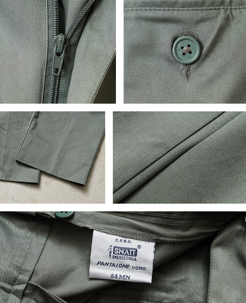 イタリア フォレストガード(森林警備隊)は、かつて存在したイタリアの警察機関の1つで、1822年に設立され、2016年に解隊後、現在ではイタリア軍の国家憲兵隊カラビニエリの専門部隊として活躍しています。森林保護や密猟の取締り、山岳救助などを行っていたフォレストガードが自然環境の過酷な条件に耐えられるようにデザインされたトラウザーズです。現在では製造されていない、手に入りにくく珍しいアイテムです。フロントはツータック仕様で適度なゆとりのストレートシルエット。ジッパーフライに、サイドにはスラッシュポケットと、バックポケットが付属したベーシックなデザイン。右ポケット付近にはコインポケットも付属しています。グレーがかったグリーン系のライトセージが新鮮な上品さも兼ね備えたパンツです。