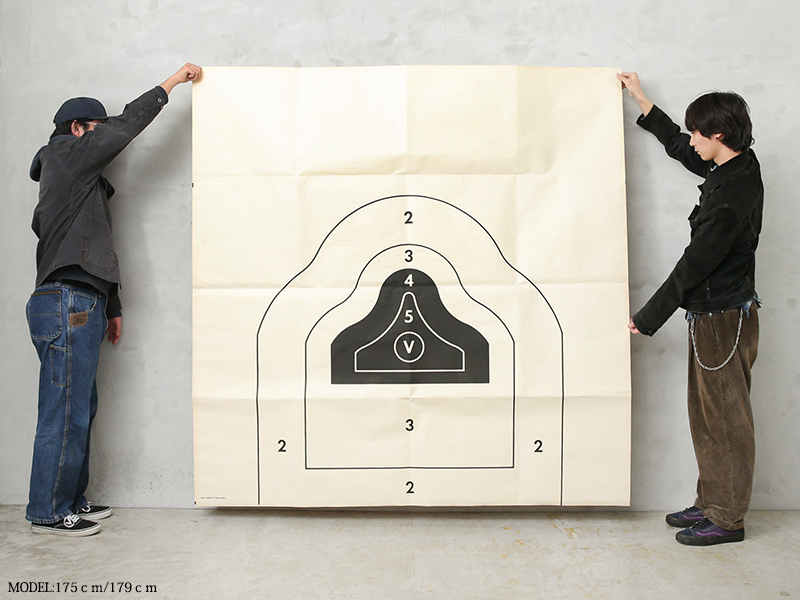 アメリカ軍で使用されている「スローファイア・シルエット・ターゲット(Slow Fire Silhouette Target)」、通称「Target D」と呼ばれる射撃用の的が登場。1966年に制定され、主にM16ライフルやM4カービンの射撃訓練、精密射撃の練習、資格試験などで使用。人間のシルエットを模した形状で、中心部(Vゾーンや5点圏)から外側に向かって点数が低くなるように設計されています。ヴィンテージ感のある紙製で、通常ではあまり散見することのない大きさのターゲットシートは圧巻の迫力。 独特な質感とミリタリーアイテムならではの雰囲気が魅力的で、お部屋やガレージ、また店舗装飾など、インテリアとして飾っても画になる一枚です。